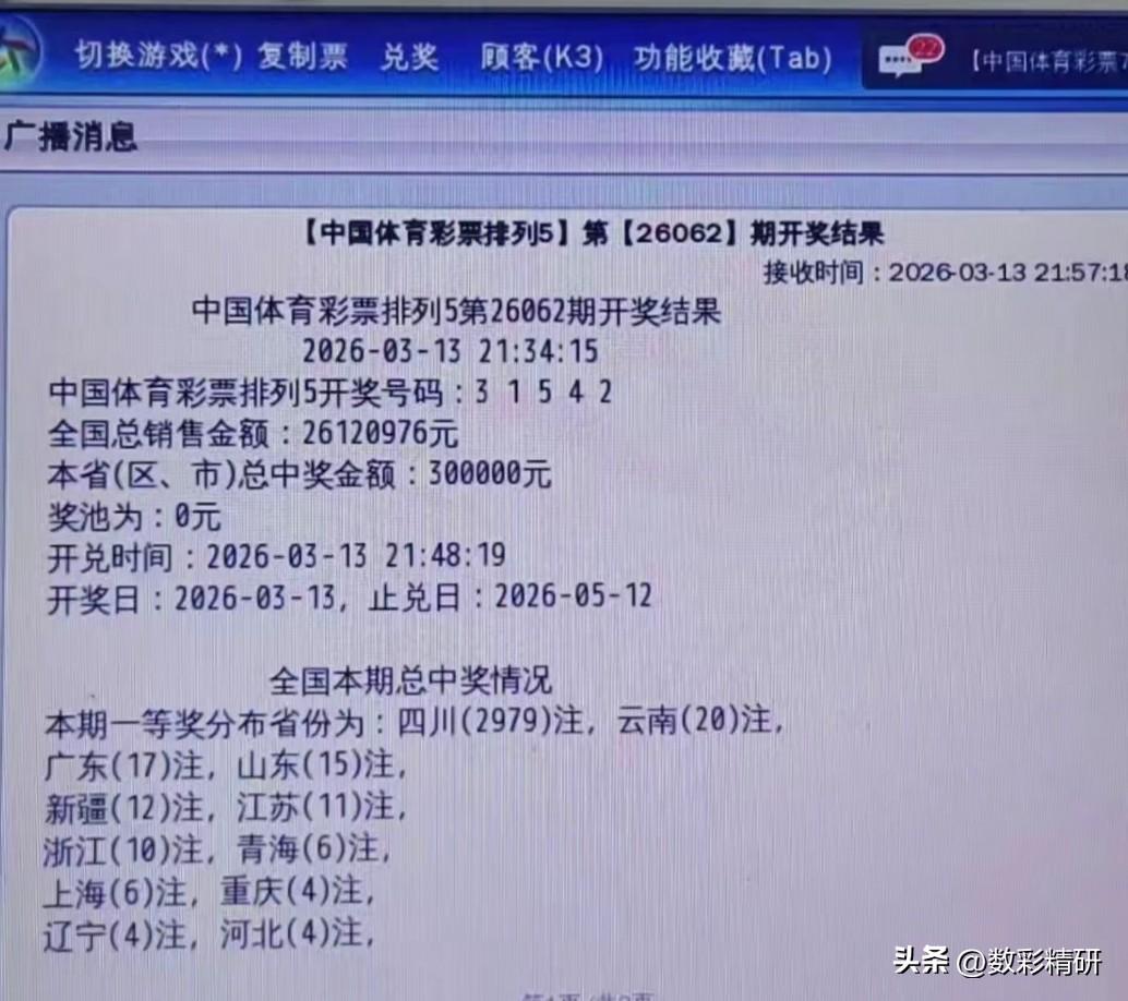 排列五惊现超级井喷!四川狂揽近3亿,奖池一夜清空。 3月13日,体彩排列五26062期开奖爆出超级盛况,全国一等奖狂开3115注,单注奖金10万元,合计派奖3.115亿元,奖池直接被掏空。 本期四川成为最大赢家,一举拿下2979注头奖,收获奖金近3亿元,占全国中奖总量九成以上。如此集中的中奖分布,引发彩民热议:究竟是一人倍投斩获亿元巨奖,还是当地彩民集体命中? 开奖号码为31542,这组号码热度极高,才造就了这一罕见中奖盛况,这一次彩民终于取得了阶段性胜利。