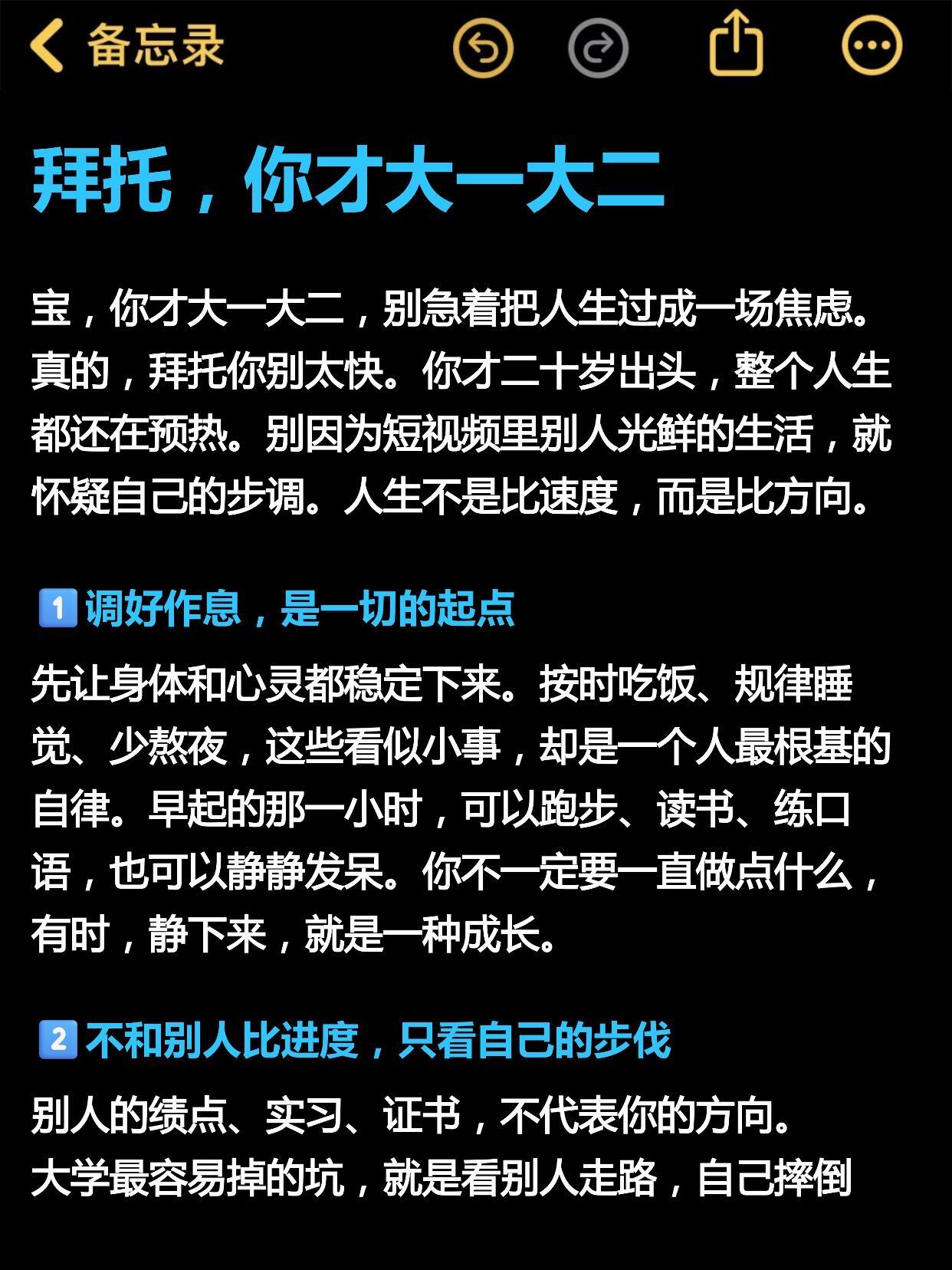 开学焕个新人设 拜托,你才大一大二,别急着把人生过成焦虑🌸宝,你才大一大二,别急着把人生过成一场焦虑。真的,拜托你别太快。你才二十岁出头,整个人生都还在预热。别因为短视频里别人光鲜的生活,就怀疑自己的步调。人生不是比速度,而是比方向。~1⃣️调好作息,是一切的起点先让身体和心灵都稳定下来。按时吃饭、规律睡觉、少熬夜,这些看似小事,却是一个人最根基的自律。早起的那一小时,可以跑步、读书、练口语,也可以静静发呆。你不一定要一直做点什么,有时,静下来,就是一种成长。~2⃣️不和别人比进度,只看自己的步伐别人的绩点、实习、证书,不代表你的方向。大学最容易掉的坑,就是看别人走路,自己摔倒。要相信——每个人的节奏都不同。有的人跑得快,有的人走得稳。但只要你一直在走,就不会被落下~3⃣️多去试错,别怕“没意义”大学最大的幸运,是你可以免费试错。参加一个社团、做一次志愿者、尝试做自媒体、创业、实习……别问“有用吗”,你只需要问——“我有没有好奇?”人生就是在一次次看似没用的探索里,找到真正想走的路。~4⃣️想到了就动手,不完美也没关系别再纠结等我准备好再开始,那一刻永远不会来。写不出完美的作品,那就先写一篇糙的。想做自媒体,那就先录一条没人看的。因为粗糙地开始,永远胜过“优雅”地拖延。~5⃣️学会松弛感,慢慢地成长焦虑,不代表你在进步;真正的成长,是在笃定中前行。别因为一时落后就慌,别因为他人耀眼就自卑。每个人都有属于自己的节奏。如杨绛先生所言:抬头自卑,低头自得,唯有平视,才能看见真实的自己。~6⃣️别急着找到答案,你只需要靠近热爱你不必现在就想明白我要做什么,你只需要知道我喜欢什么。当你一直去靠近让你发光的事情,你的人生自然会有光。每个方向都可能通向未来,关键是——你愿不愿意迈出那一步。~🌸最后梅子学姐想说:别怕自己慢,慢一点没关系。你不是在落后,而是在打基础。你要允许自己没那么优秀、没那么自信、没那么确定。因为所有后来活得通透的人,都经历过一段不明所以的迷茫。~如果你想了解更多大学信息差,自律成长,提升自己,拜拖迷茫欢迎和我唠一唠嗷~开学季