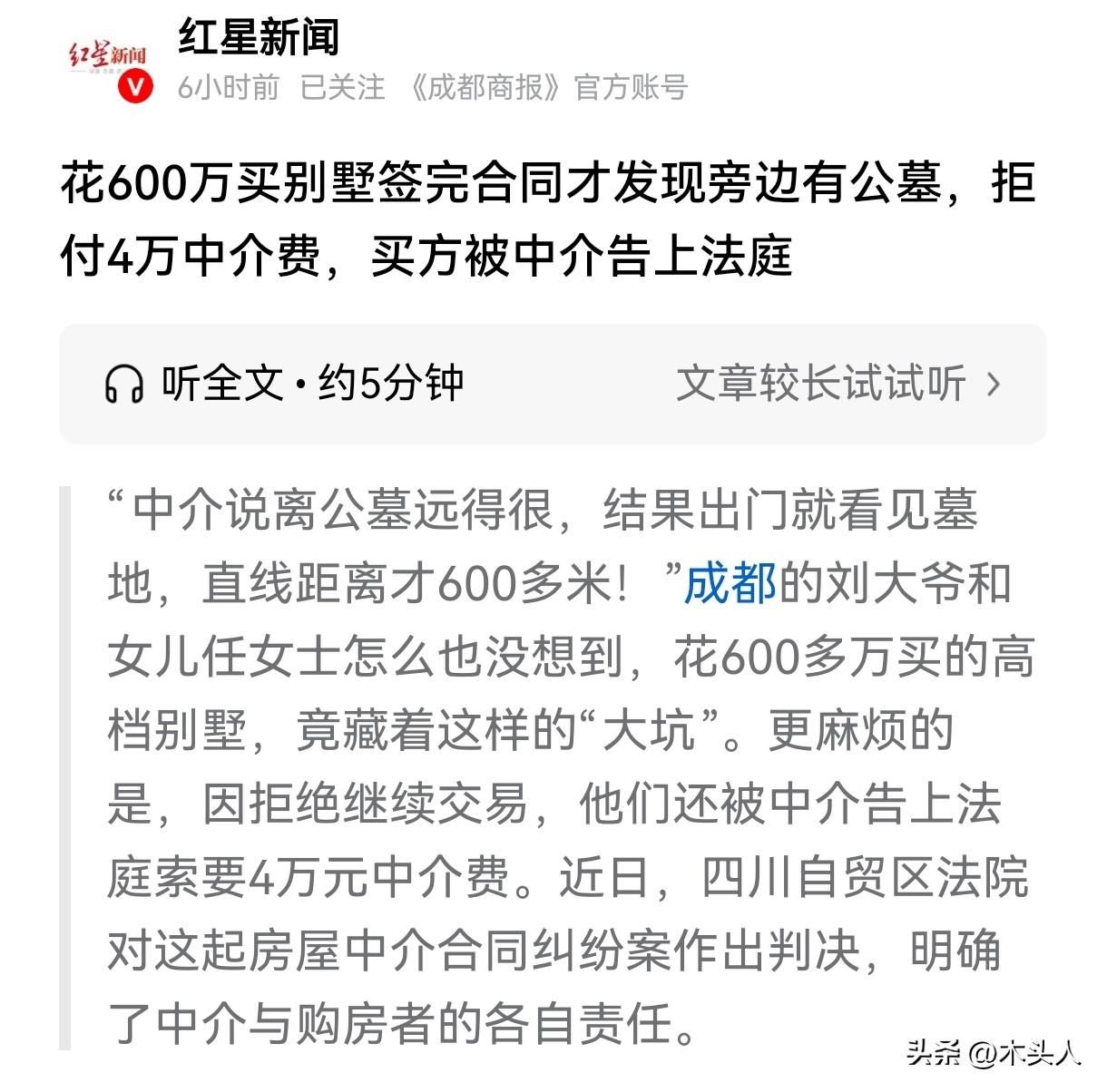 “离谱至极!”四川成都,大爷和女儿想买一套600多万的房子,他们在签合同前,问了中介“这个地方离公墓远不远?”中介回复“远的很!”大爷和女儿很信任对方,当即签了合同,并支付了20万定金,可他们从小区另一扇门出来后,发现小区马路斜对面就是公墓,直线距离628米,步行800米。大爷和房东解除了合同,20万定金赔给了房东。可没想到,数月后,中介却把他们告上法庭,要求他们支付4万元中介服务费和违约金。 刘大爷勤勤恳恳一辈子,年过6旬的他,想着改善一下家里的居住环境,换套新房子,对于父亲的想法,女儿任女士也很赞同。 2024年初,两人通过中介,看中了一套300多平、总价600多万的别墅,房子大气美观,环境也好。 唯一美中不足的是,任女士听说那附近有公墓,为了保险起见,她还特意问了中介:“这个地方离公墓远不远?” 中介回答:“远得很!” 刘大爷和任女士听了中介的话,心里的大石头落了地,没再多想,就决定买下这套房子。 在中介的协助下,刘大爷父女与业主顺利签了合同,还交了20万定金。 签完合同,刘女士父女心情格外舒畅,两人特意从小区另一门出来,打算到附近走走。 他们出来后,结果看到小区马路斜对面就是公墓。 任女士拿手机测量了一下,两地直线距离竟然只有628米,步行也就800多米。 也就是说从他们的房子就能看到公墓,他们买的是墓景房。 对于这个发现,刘大爷和女儿都不能接受,经过沟通,他们决定放弃购买这套房子。 之后他们和业主达成一致意见:20万定金作为赔偿,给了业主,双方解除合同。 他们本来以为这件事情就这么过去了,可没想到数月后,中介却把刘大爷父女告上了法庭。 《民法典》第963条规定:中介人促成合同成立的,委托人应当按照约定支付报酬。 中介声称他们已经完成了带看服务,刘大爷父女和业主也签了合同,这就意味着他们的服务已经完成了,刘大爷父女必须支付4万元的中介服务费和违约金。 刘大爷父女又气又急,他们觉得中介故意隐瞒公墓距离这么重要的信息,导致他们买不成房子,还赔了20万定金,现在居然还要他们付中介费,这实在是太不合理了。 法庭上,双方各执一词。 中介坚持认为自己按照流程提供了服务,就应该得到相应的报酬。 而刘大爷父女则强调中介存在欺诈行为,他们是因为中介的虚假承诺才签的合同。 法院会怎么判? 《民法典》第962条规定:中介人应当就有关订立合同的事项向委托人如实报告;若故意隐瞒重要事实或提供虚假情况,损害委托人利益的,不得请求支付报酬,并应当承担赔偿责任。 任女士明确问过中介这个地方离中介远不远,可中介却回答“远的很”,并未告知实际距离,也没有说明公墓就在小区马路对面,对房屋周边的真实情况未做到客观、详尽的披露,导致了刘大爷父女做出错误决策。 但是购房者本身对周边环境如有特殊要求的,不能仅凭中介口头答复来确认,而是应当去实地勘察核实,刘大爷父女自身也存在一定的疏忽。 法院认为:虽然中介在回答公墓距离问题含糊回答,存在过错,但中介提供了带看、签约等服务,酌情判定刘大爷父女支付12000元中介费用给对方。 买房是人生大事,不要只听别人说,就匆匆下定,而是要实际勘察,了解实际情况后,再确定要不要买。 对于此事,大家怎么看?