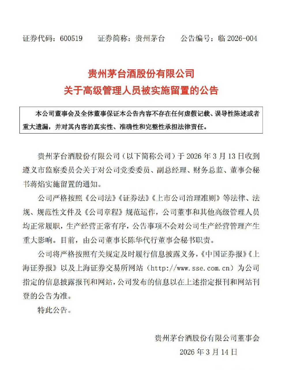 贵州茅台酒股份有限公司党委委员、副总经理、财务总监、董事会秘书蒋焰涉嫌严重违纪违法,目前正接受贵州省纪委监委派驻贵州茅台酒厂(集团)有限责任公司纪检监察组纪律审查和遵义市监委监察调查。
