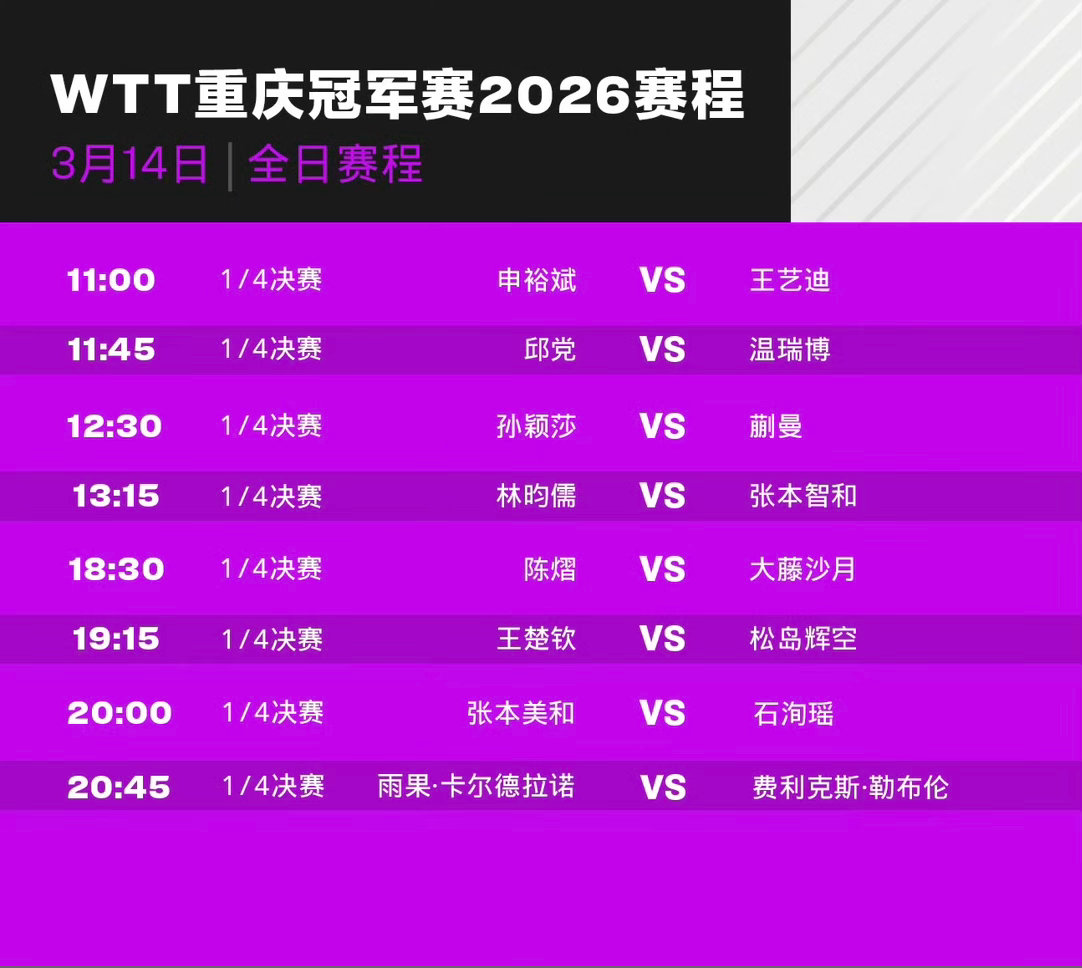WTT重庆冠军赛2026 3月14日赛程