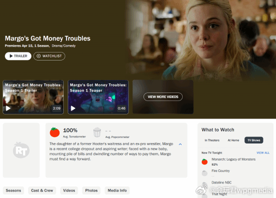 艾丽·范宁饰演OnlyFans从业者 《玛戈没钱了》烂番茄开分满分由艾丽·范宁(Elle Fanning)领衔主演的电视剧集 《玛戈没钱了》(Margo’s Got Money Troubles) 第一季媒体评价于今日正式开分。该剧在知名影评网站 烂番茄(Rotten Tomatoes) 上的新鲜度达到了 100%,口碑呈现出一边倒的赞誉。该剧改编自鲁菲·索普(Rufie Thorpe)的同名小说。故事聚焦于一位陷入生计困境的年轻母亲玛戈。在走投无路之际,她从疏远已久的父亲那里得到了“职业建议”——这位拥有丰富职业摔角经验的父亲建议她将摔角中的“人设开发”应用到OnlyFans账号上。虽然玛戈因此迅速走红,但随之而来的网络名气也让她开始怀疑:这种成名的代价是否过于高昂?影评人们对艾丽·范宁的表演赞不绝口,认为她赋予了这个复杂角色鲜活的生命力:Mama's Geeky 的 Tessa Smith 评价道:“范宁在剧中熠熠生辉,这是一部关于母职、性工作和家庭混乱的机智且令人感同身受的作品。”ScreenAnarchy 的 Peter Martin 则重点称赞了角色的层次感:“范宁完美诠释了一个复杂、多面、冷酷计算却又热情奔放,且具备至高母性的玛戈,表现非常精彩。”AwardsWatch的 Tyler Doster 直言:“新晋奥斯卡提名者范宁完成了她迄今为止最好的表演之一,她演活了一个拼命想为孩子创造未来的年轻女性。”