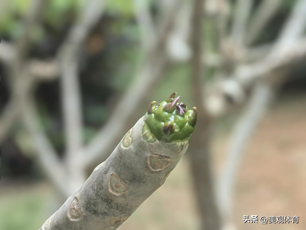 进入三月,海南文昌的鸡蛋花树开始从树枝的顶端开始萌芽生叶,按照物候规律,直到清明