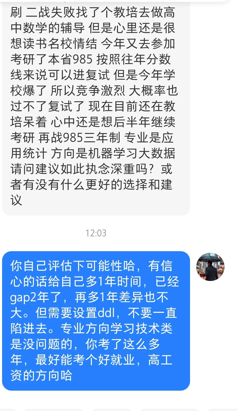 投稿:博主我想问一下 我的个人情况是本科双非一本经济统计专业 大四没有职业规划直接选择考研本省211 数学考84总分350距离复试线30分遗憾落榜 第二年再战学好了数学123总分345(换学校了也是本省211 专业课比较难)但是贴线进复试被刷 二战失败找了个教培去做高中数学的辅导 但是心里还是很想读书名校情结 今年又去参加考研了本省985 按照往年分数线来说可以进复试 但是今年学校爆了 所以竞争激烈 大概率也过不了复试了 现在目前还在教培呆着 心中还是想后半年继续考研 再战985三年制 专业是应用统计 方向是机器学习大数据 请问建议如此执念深重吗?或者有没有什么更好的选择和建议