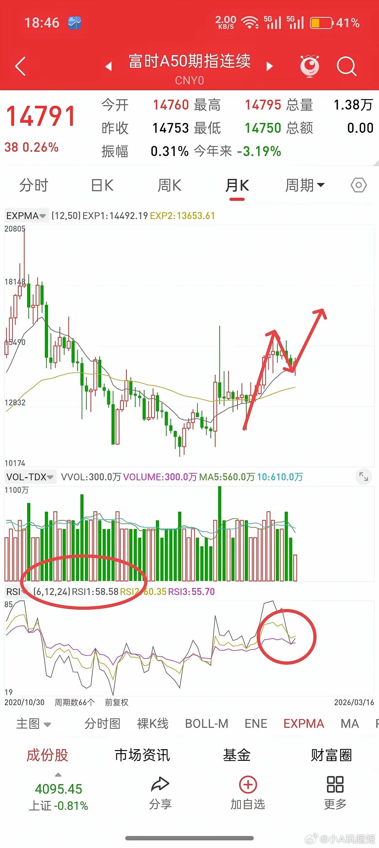盘后,富时A50股指,香港股指期货直线拉升,今天或最后的洗盘,下周很可能直接反包,直逼新高。富时A50股指月线级别已经打到EXPMA白线支撑,Rsi指标也是从前期的超买,修复到目前58,标准的正常多头趋势。大盘自1.14号见阶段高点4190,到期间回调,再反弹,打出另一个高点4197,阶段低点4002,4050左右,可以说基本就在4000-4200这个大区间震荡。既然是震荡,又不是单边行情,有什么好担心的呢,很多人一看到行情跌了,就慌,一看到行情涨了就冲动,如果不加以改变,这种只能沦为资本市场的炮灰。目前大盘下方支撑60日均线4060附近,五月均线也是4050附近,前顶又是4025-4034,这些关键支撑,前面已经打到,后面不一定再给机会,所以,4100下方,机会已经大于风险,我甚至怀疑,今天就是新一波行情启动的最后洗盘。主力就是要把恐慌盘,不坚定筹码,套牢盘等等给洗出去,为后面拉升做准备。敬请期待吧!