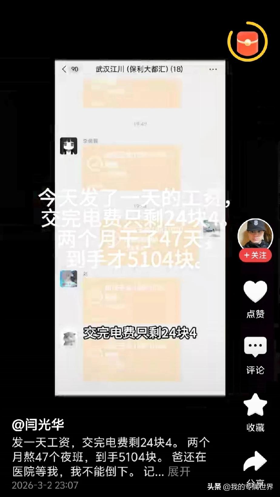 我今天看到这个小兄弟在长沙本地大楼做保安,一天12小时110,管吃不清楚,住宿一个月扣几十块钱,好像长夜班他说晚上不能睡觉和玩手机,干了47天扣完水电费还剩5104块,我也是干了好长时间的保安,我建议想挣钱不要在老家做,除非迫不得已家里有事出不去,想要挣钱去上海、广东,保安一天平均200左右,大多数是包住不包吃,一个月上满不比工厂工资低,想要包吃包住轻松工资低点可以去北京,一个月小4000管吃管住,好多连被子都不用买,吃的也好,大多吃公家的,吃的绝对不会太差,最主要8小时比较多上班时间短,我也是长夜班,但我上班相对轻松,除了不能睡觉,没事看看手机也没人会说,我现在260一天,上满勤基本8000,同样都是上夜班12个小时,上面的小兄弟干两个月才6600,还没我一个月工资高,干保安是有方向的,同样都是12小时,换个地方待遇明显不一样,还有我只是给大家个建议和方向,不要问我招保安不招,我自己只是个上班的保安,我不招人这个得你自己去找。