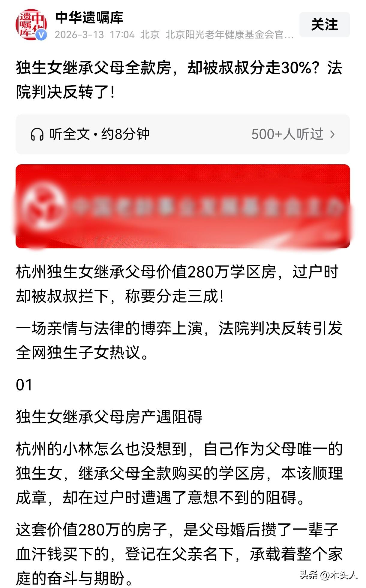 “要钱不要脸?”浙江杭州,父母去世后,给女子留下一套280万的房子,叔叔们却说:大哥早于母亲去世,这套房子他们也有份,要求侄女要么给他们100万,要么把房子卖了,按照比例分。女子怒了:我父母的房子,凭什么分给你们。她将叔叔姑姑告上法庭,结果让她失望至极。 小林是家里的独生女,打小就被父母捧在手心里疼,可命运弄人,父亲去世后,留下小林和母亲相依为命。 可不久后,母亲也去世了,只留下小林孤零零一个人。 料理完父母的身后事,小林想起父母给她留下了一套280万的房子,这套房子是父母婚后购买的,也是他们一辈子的心血。 她整理了资料,去了不动产交易中心,办理房产继承的事情,她原本想着自己是家里的独生女,这套房子理应归自己所有。 可没想到,她被告知这套房子存在争议,暂时不能过户。 小林懵了,经过询问后才得知,原来小林的父亲比奶奶先去世,父亲去世后,他留下的遗产可由小林、小林母亲和小林奶奶去世。 现在奶奶也去世了,她留下的份额可以由奶奶的4个子女,即小林的父亲(已去世,由小林代位继承)、2个叔叔和1个姑姑继承。 还没等小林去找叔叔姑姑商量,叔叔们就找上门来了,他们的态度非常强硬:“你奶奶的那份遗产,我们也有份,你要么给我们100万,要么把房子卖了,大家按照比例分,不然,这房子你就本想过户了,大家都这么耗着。” 小林气得浑身发抖,这是自己父母的房产,自己是家里的独生女,凭什么还要把自己家的房子分给叔叔姑姑们,叔叔姑姑也没有把他们的东西给自己啊,这也太不讲道理了。 可叔叔们说什么都不肯让步,小林无奈之下,将2个叔叔和姑姑告上了法庭。 那么,从法律角度来说,该如何看待此事呢? 小林的父亲去世后,并未留下遗嘱,按照法定继承处理他的遗产。 《民法典》第1127条规定:配偶、子女、父母都是第一顺位的法定继承人。 小林父亲去世后,小林的母亲、小林和小林奶奶都是第一顺位的继承人,三人都可继承小林父亲的遗产。 这套房子属于小林父母的夫妻共同财产。 《民法典》第1153条规定:夫妻共同所有的财产,除有约定的外,遗产分割时,应当先将共同所有的财产的一半分出为配偶所有,其余的为被继承人的遗产。 也就是说这套房产的50%作为小林父亲的遗产,可由他们三人继承,小林奶奶可继承房产总额的1/6。 奶奶去世后,她这1/6份额由他的4个子女继承,折算后每人分得总份额的1/24。 最终,小林向叔叔姑姑们支付了35万元房屋折价款,房屋归小林所有。 有人说如果小林父母留下的是是一笔外债,叔叔姑姑们还快跳出来争吗? 在法律上,叔叔姑姑们确实站住了脚,但是从亲情角度出发,确实不尽人意了。 哥嫂就留下这么一个女儿,作为长辈,应当替他们好好照顾侄女,可他们却跳出来跟侄女争房子,确实让人低看几分。 如果是放在兄弟情深,家庭关系好的家庭,叔叔姑姑估计就会放弃继承,把房子全部给到侄女了。 对于此事,大家怎么看?
