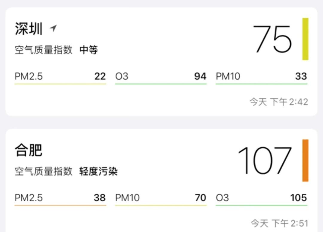 直观的灰霾层 第一张图是合肥起飞后(空气质量极差,污浊) 第二张图是走到半中间(灰霾层依然存在) 第三张图是广东省境内(空气清透了许多) 往南边走,就能发现灰霾层巨厚且范围巨大 飞了2小时还是有霾 直到接近海边才好一些 两地数值差得不多,但是高空看上去空气质量还是有差异的 今天在这边可以脱离口罩,正常呼吸 对中部城市来说,干净的蓝天真的很稀缺