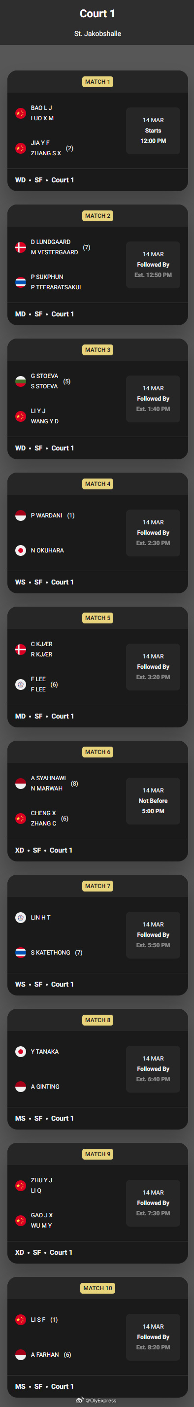 【瑞士赛半决赛赛程对阵】2026年瑞士羽毛球公开赛羽联超级赛 3月14日巴塞尔,2026世界羽联超级300瑞士公开赛将进行半决赛,比赛将于北京时间19时开始,国羽赛程对阵如下,完全赛程对阵见图:男单:李诗沣vs法汉(印尼)女双:贾一凡/张殊贤vs鲍骊婧/罗徐敏李怡婧/王漪朵vsG-斯托耶娃/S-斯托耶娃(保加利亚)混双:高家炫/吴梦莹vs朱一珺/李茜程星/张驰vs萨赫纳维/马瓦赫(印尼)