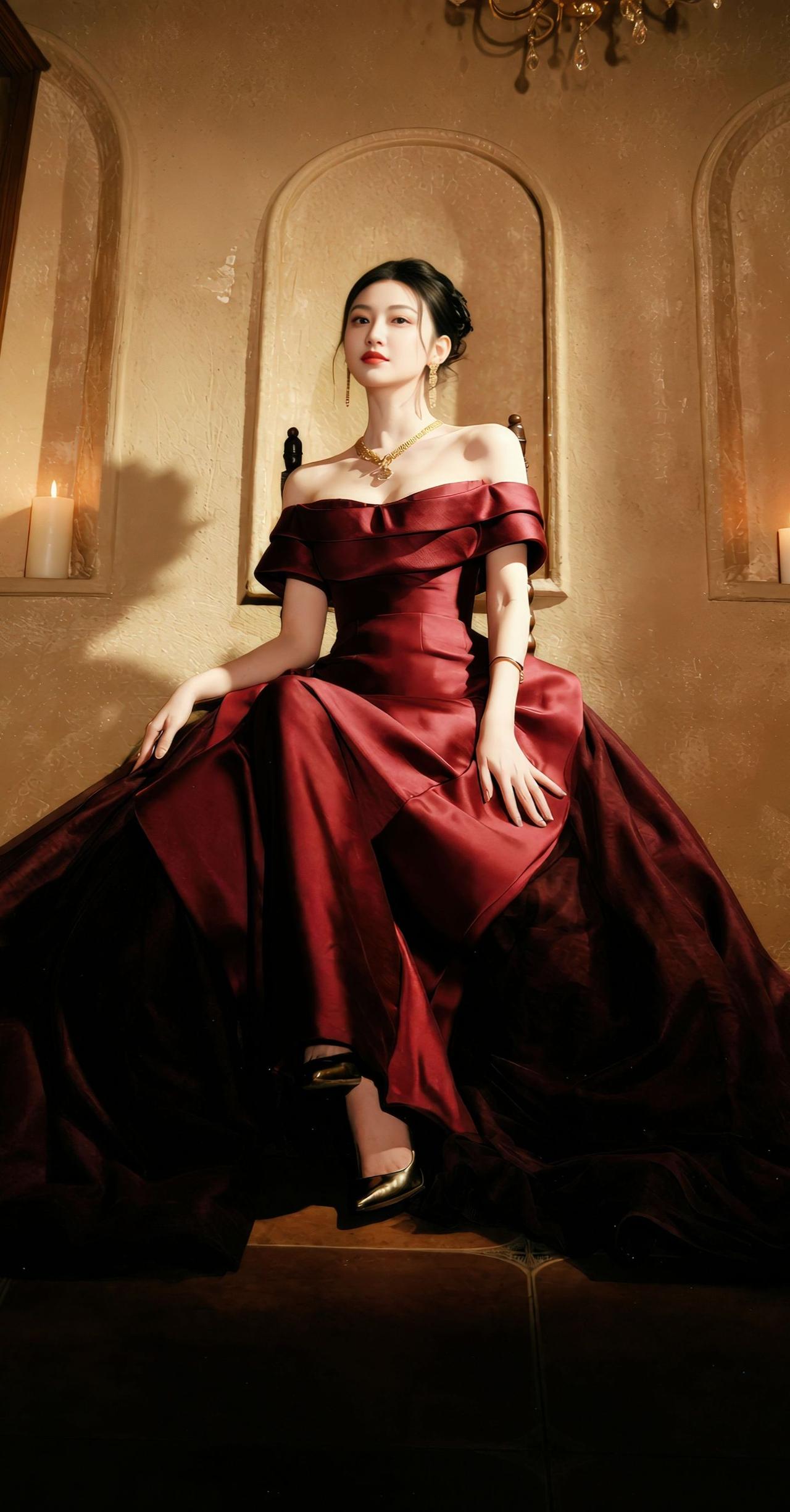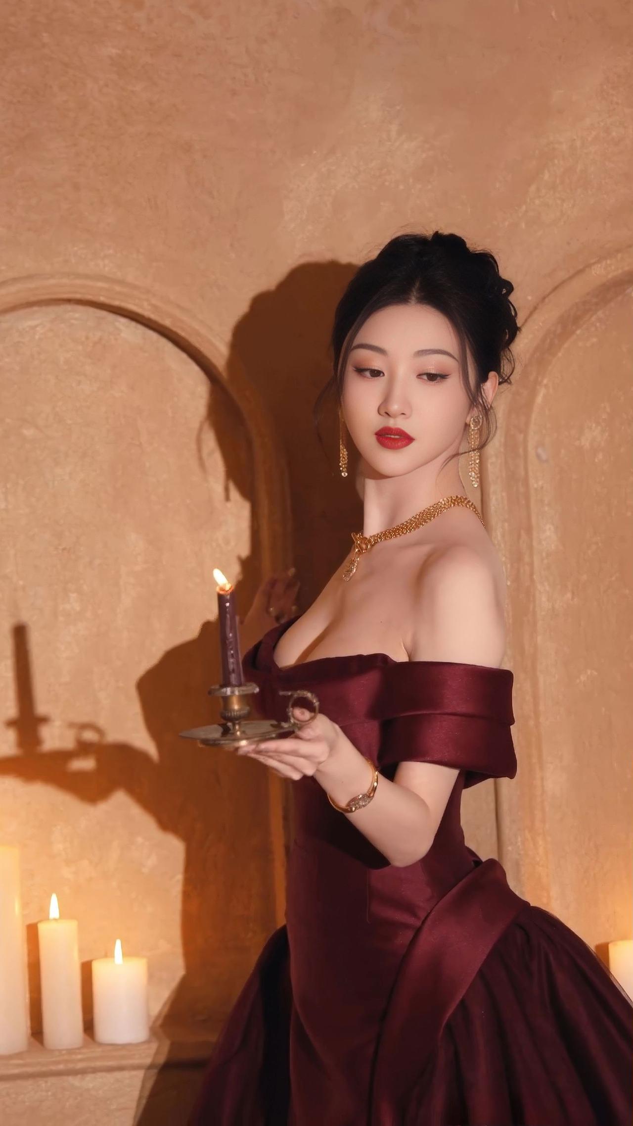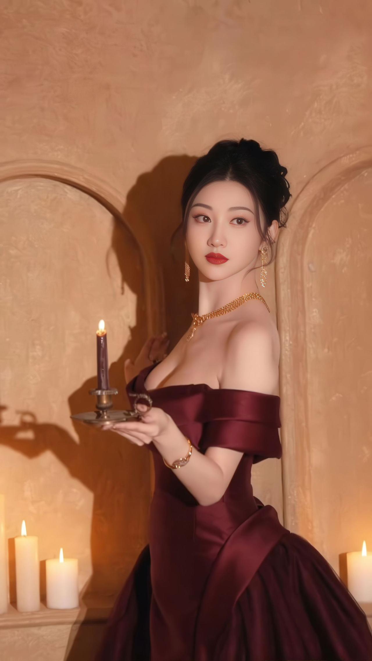 景甜 墙是暖黄的旧羊皮纸 拱门将光折成温柔的弧度 你把烛火托在掌心 让夜色在酒红的裙裾上,慢慢洇开 金链是锁骨间的星子 垂落的耳坠,摇响时光的碎响 每一次抬眼,都让烛影 在睫毛上,轻轻颤栗 后来你坐在椅上 把裙摆铺成一片暗红的海 黑丝绒裹着脚踝,高跟鞋 叩响地板,像心跳的回声 光从窗洞漏进来 吻过你的肩线,吻过裙褶的褶皱 而烛火始终亮着 替所有未说出口的句子 在墙上,投下温柔的轮廓
