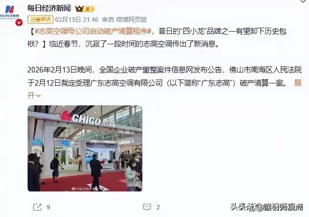 32亿旧债压垮老牌巨头,志高破产背后的“金蝉脱壳” 2026年2月,佛山法院裁定志高空调破产清算,这个曾与格力并肩的“空调大王”背负32亿巨债倒下。但真相是,这并非品牌消亡,而是一场 “精准排毒” 。早在2021年,志高已将核心业务剥离至“志高格物”,旧壳还债,新体求生。 衰败根源有三: 一是盲目多元化,抽血主业;二是研发躺平,产品质量口碑崩塌;三是渠道误判,错失电商红利。截至2025年,其国内份额已不足0.2%。 民生视角看: 虽然老主体倒下,但新主体在海外找到出路,2025年外销增长超50%,保住了生产线和工人饭碗。 唤羽师小结: 志高的悲剧在于用过去的经验应对未来的竞争。它警示我们:没有技术的低价是短跑,没有创新的品牌是危楼。 旧壳已死,新路漫漫,这才是中国制造转型的真实阵痛。许昌志高空调 蓝山志高空调 志高吊扇 志高电视机 许昌志高 志高锂电 志高文体 荔波志高空调 志高冰箱维修 志高灯饰 志高壁扇 志高文具 志高电动机 志高制氧机 志高移动冷空调