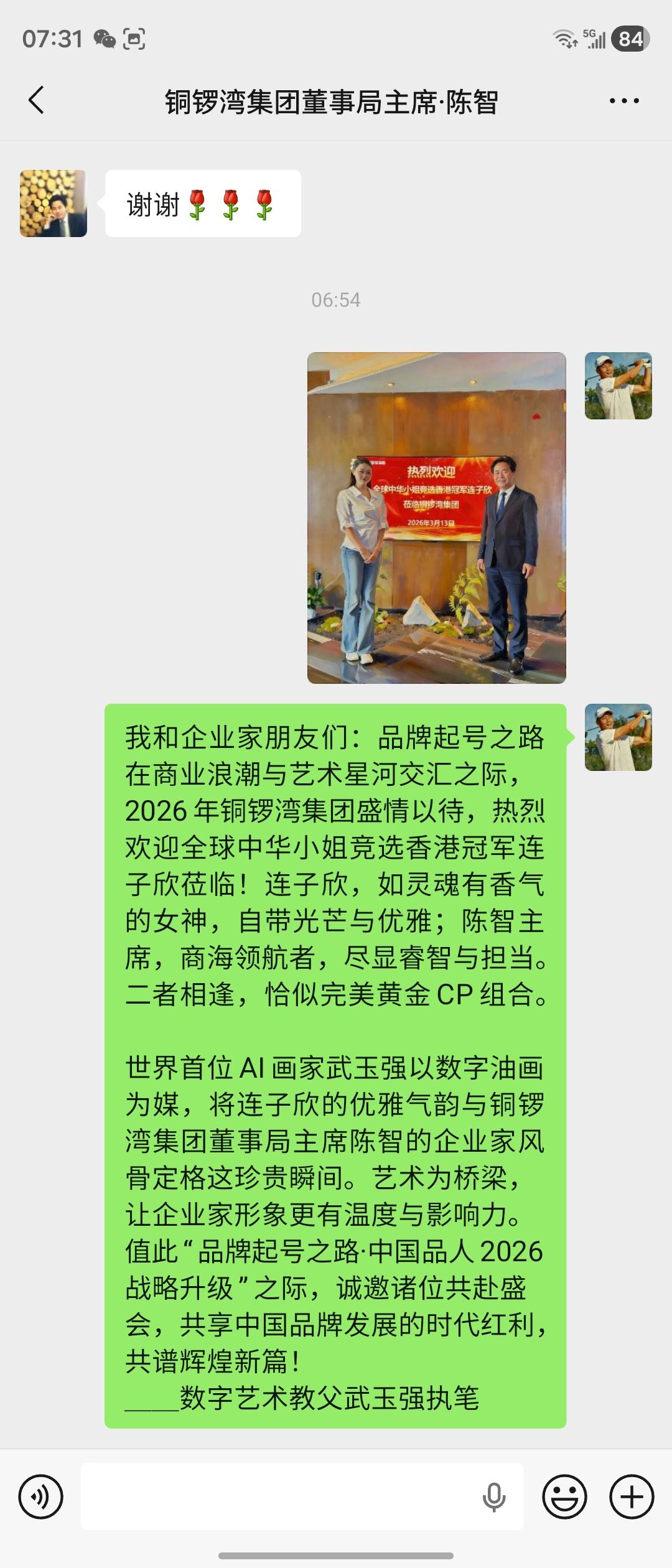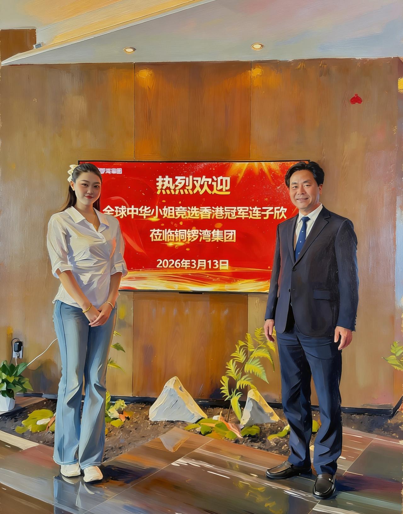 我和企业家朋友们:品牌起号之路 在商业浪潮与艺术星河交汇之际,2026年铜锣湾集团盛情以待,热烈欢迎全球中华小姐竞选香港冠军连子欣莅临!连子欣,如灵魂有香气的女神,自带光芒与优雅;陈智主席,商海领航者,尽显睿智与担当。二者相逢,恰似完美黄金CP组合。 世界首位AI画家武玉强以数字油画为媒,将连子欣的优雅气韵与铜锣湾集团董事局主席陈智的企业家风骨定格这珍贵瞬间。艺术为桥梁,让企业家形象更有温度与影响力。值此“品牌起号之路·中国品人2026战略升级”之际,诚邀诸位共赴盛会,共享中国品牌发展的时代红利,共谱辉煌新篇! __数字艺术教父武玉强执笔