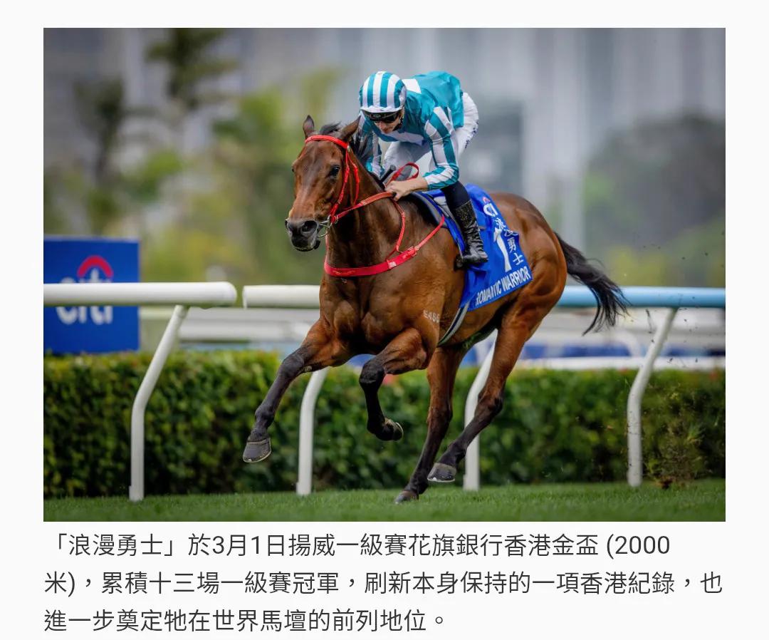 香港电视台报道本地赛驹“嘉应高升”和“浪漫勇士”荣膺最新一期全球马匹评分排行榜首一二名,另外还有“金钻贵人”及“骄阳名驹”进踞排榜前二十名,牠们的全球评分分别为128分,124分,118分及117分。漫漫香港跑马历史,见证香港赛马最鼎盛辉煌时刻,史无前例的本地训练的马匹高踞包办全球排榜首一二名。各马匹拍卖会高价名种稚驹运港训练服役,顶级练马师骑师云集香江从业,阵容强盛一时无两!