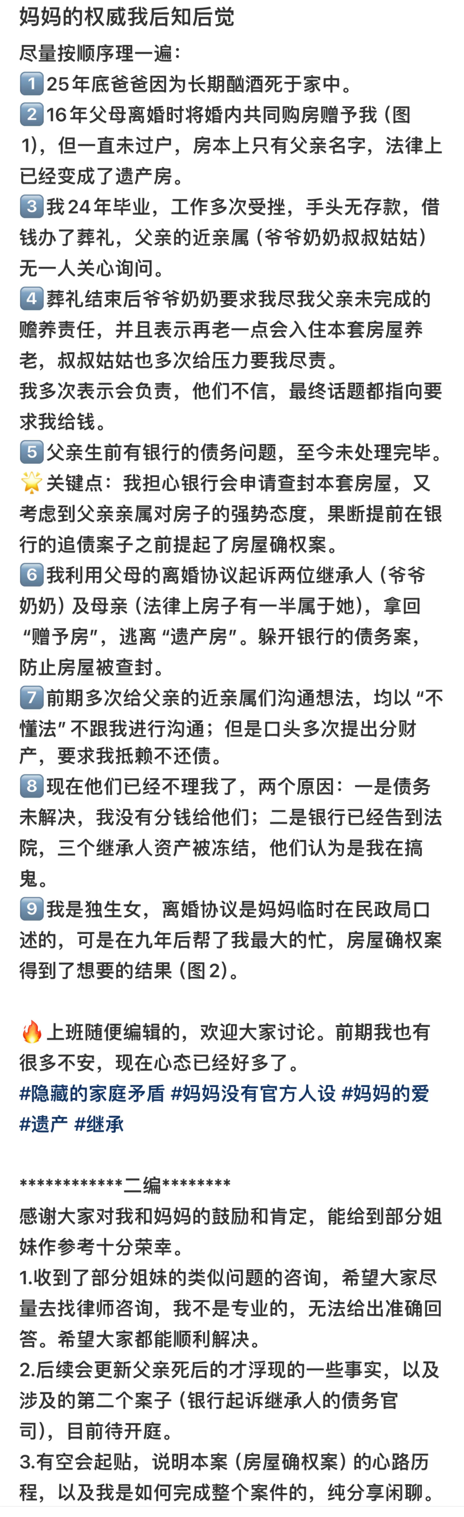 就是当年她父母签下的离婚协议,房子虽然没有过户,但是实际算赠予了,不计入遗产范围,也不会被拿去抵债…好有先见之明的母亲…妈妈的权威我后知后觉