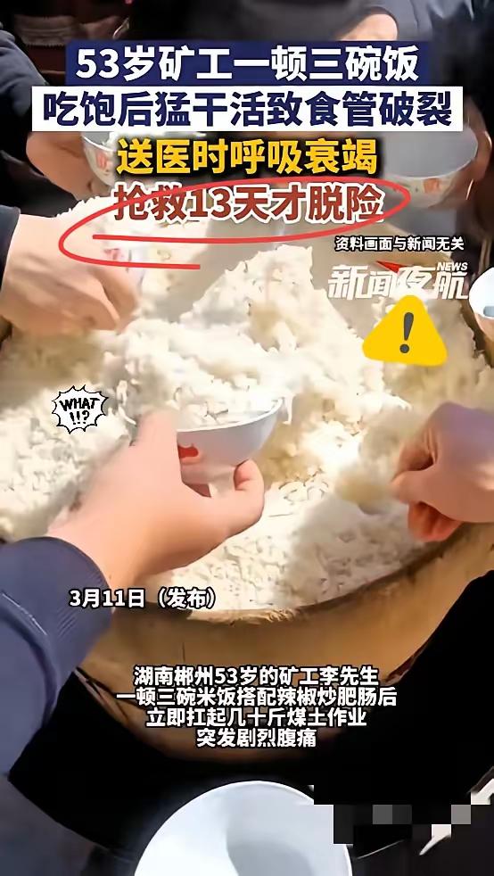 真的太吓人了!湖南一位53岁矿工,干完活饿极了, 猛吃三大碗米饭加辣椒炒肥肠,吃完一刻没歇就去扛煤土干重活。 结果突然剧烈腹痛,送到医院直接确诊食管破裂,还引发了呼吸衰竭和脓毒症,整整抢救13天才捡回一条命。 很多干体力活的人都觉得,吃饱赶紧干活没事,可风险真的极大。饱腹后腹腔压力本来就高,再突然用力,压力一冲,食管随时可能破裂,这可不是小毛病。 再急的活儿、再赶的时间,都比不上一条命重要。饭吃八分饱,饭后歇一歇,真不是啰嗦,是在救命。 你平时吃饱后会休息一会儿再干活吗?