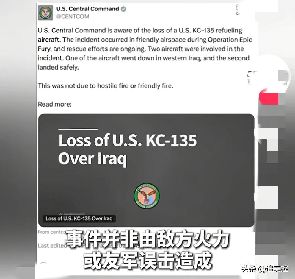 美军kc135空中加油机坠毁在伊拉克。 目前美军的说法和伊朗的说法到底谁更准确呢? 我们只能从现场坠毁的一些图片和kc135加油机从出生到现在的经历来分析。 其一,kc13加油机是一款相当老的飞机,历史上曾发生过为轰炸机加油时碰撞爆炸的事故; 其二,伊朗说是伊拉克民兵组织打下来的,那就意味着有情报来源,在加油机起飞的时候攻击造成的,如果不是,那就意味着民兵组织有更高级的攻击型导弹,在加油机飞行状态下击中坠毁的。 不可否认的是机组人员全部死亡,美军公开的伤亡数字高达一百五十多人了,战争决策者面临的国内压力不能躲闪了吧。 战争残酷,你是发动方也不意味着万无一失。 收手停火吧,美国和以色列,想想当年法西斯德国何等猖狂,小日本何等猖獗毫无人性,下场就是失败投降。 人类不答应战争和杀戮!
