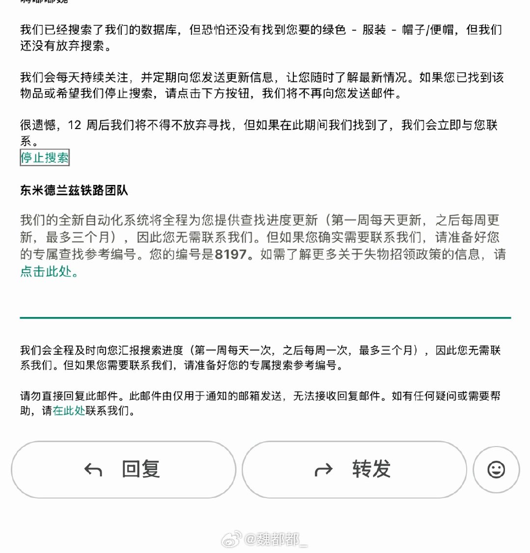 🥲🙏首先谢谢幸运之神眷顾 让我失而复得 没收到这封邮件差点忘记取消登记的失物招领事情是这样刚上车感觉很闷很热 把帽子 围巾都摘了 在座位上之后以为自己放进了包包里 也可能我记错放在腿上 下了车依旧以为帽子在包里 走了一段距离才发现不见了 赶紧回去服务中心但是没人 给EMR打了电话又说这是票务中心无法联系工作人员 要自己去网站登记 登记完想着如果丢了/实在找不到就算了 不要影响出来的心情 虽然但是真的很喜欢这顶帽子 后面返程的火车是随意选择的时间 上了车还开玩笑说去之前相似的座位吧 按照之前上车一直向前走穿过一道门 因为根本不知道哪个车厢哪个座位 直到看见帽子在一个桌子上的惊讶 我的天…………!!!!!! 中间已经经过了几个小时 我和朋友完全不敢相信 居然能找回