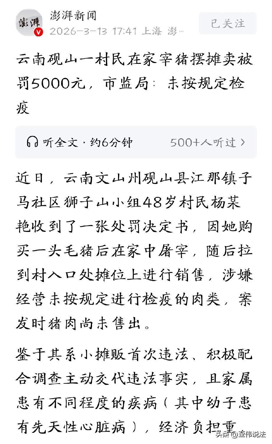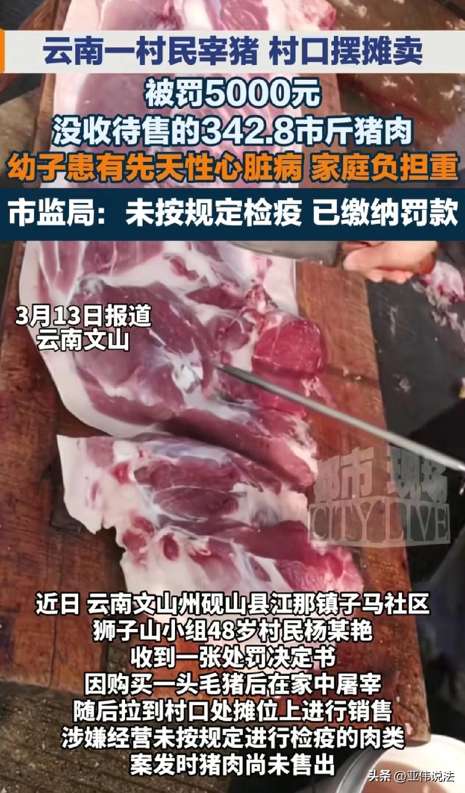 云南文山,48岁女子丈夫残疾,儿子有心脏病,家里条件苦,没钱过年。于是,她从市场买了一头毛猪,然后自己在家宰了,拉到村口去买。本想着赚点差价好好过年,万万没想到,市监局工作人员表示,她售出未检疫的肉类,已涉嫌违法,不但没收了她342.8市斤猪肉,还要罚款5000元。一斤猪肉都还没卖出去,却还要搭进去这么大一笔钱,女子天都塌了,老百姓想挣点怎么就这么难! 女子杨某是一个老实巴交的农民,文化水平不高,今年48岁。 她丈夫身体不好,小儿子还患有先天性心脏病,为了给孩子治病,家里早就掏空了积蓄,还欠了不少外债。 平日里,她就靠着在村口摆个小摊,卖点东西补贴家用。 2026年1月12日,杨某想着快过年了,猪肉应该好卖,便咬咬牙,从县城小一家生猪市场买了一头毛猪,花了差不多一千块钱。 她盘算着,自己宰了拉到村口卖,没有中间商赚差价,应该能多挣一点。 于是第二天一大早,她找来几个帮手,在自家院子里把猪杀了,收拾干净后,一共得了358.8市斤猪肉。 她留了16斤自家吃,剩下的342.8斤用三轮车拉到村口处的摊位上,准备按10.5元一斤的价格卖掉。 她算了算,要是能把这些肉都卖出去,就能给孩子攒点药钱,他们家也能勉强过个年。 可她没想到,猪肉刚摆上摊没多久,当地市场监督管理局的执法人员就来了。 他们检查发现,杨某卖的猪肉上既没有屠宰检疫验讫印章,也没有肉品品质检验合格章,她本人也拿不出《动物检疫合格证明》和《肉品品质检验合格证》。 执法人员当场把猪肉扣押,并告知她涉嫌违法经营。 杨某顿时就懵了,她压根没想到,自己花的钱,自己宰的猪,怎么就犯法了? 她反复解释,说猪肉是自己刚杀的,绝对新鲜,不会有问题。 可执法人员告诉她,不管肉好不好,按照规定,没有检疫的猪肉是不能上市销售的。 没收教育还不算晚,杨某私自卖猪肉还被立案调查。 执法人员到村里核实情况,走访邻居,也了解了杨某的家庭状况。他们发现,杨某确实是第一次干这事,之前也没被处罚过。 案发后,她特别配合调查,问什么答什么,态度很诚恳。 更让执法人员心里不是滋味的,是她家里的情况:丈夫患病干不了重活,小儿子先天性心脏病常年要吃药,一家人的生活重担全压在她一个人身上。 村里人也说,杨某平时老实本分,这次确实是日子太难了,才想着自己杀猪卖钱。 调查下来,这些猪肉按照她定的售价,总货值是3767.4元,因为还没开张就被查了,她没有违法所得。 《食品安全法》第三十四条规定:禁止生产经营未按规定进行检疫或者检疫不合格的肉类,或者未经检验或者检验不合格的肉类制品。 食品安全监督管理部门没收违法所得和违法生产经营的食品,并可以没收用于违法生产经营的工具、设备、原料等物品。 货值金额不足一万元的,并处十万元以上十五万元以下罚款。 杨某销售的猪肉无检疫印章、无检疫合格证明,属于未经检疫肉类,直接违反《食品安全法》。 按照规定,最低也要罚款10万元。这个数字对杨某来说,简直是天文数字。 但考虑到杨某首次违法、无违法所得、配合调查、家庭困难,2月24日,市场监督管理局给她送达了《行政处罚告知书》,对她拟处罚5000元,并告知她有陈述申辩的权利。 拿到告知书的时候,杨某手都在抖,5000块对她家来说也是很大一笔钱,她实在想不通,自己想靠双手挣点钱,怎么就那么难! 但她知道,这已经是执法人员照顾她家情况后给的最低处罚了,她没有再说什么,默默接受了。 3月13日,市场监督管理局证实,杨某已经缴清了5000元罚款,那342.8斤猪肉被依法没收处理。 执法人员临走前反复叮嘱她,以后一定要守法经营,不能再私下宰猪卖肉了。 杨某知道,执法人员没把话说死,也是体谅她的难处,可未来的日子怎么过,她实在不敢想。 对此你怎么看?