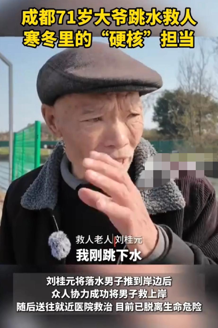 1月7日,寒冬腊月,成都府河水冰冷刺骨,湍急奔涌。一道身影从数米高的河堤纵身跃下,奋力游向已被冲散数十米、失去意识的落水者。10分钟后,生命得以挽回。令人震惊的是,施救者刘桂元,今年已经71岁。 “我还是刷视频看到的,冰欠的水啊,哪个不怕?70岁的人了,有这勇气,真了不起,勇敢! 成都腊月的河水有多冷?当地老百姓最清楚,那水凉得能瞬间冻透骨头缝,年轻人碰一下都得打个寒颤,更别说在湍急的水流里游上几十米。71岁的刘桂元压根没给自己犹豫的时间,当时他正蹲在河堤边遛弯,呼救声扎进耳朵里的瞬间,他拨开围堵的人群就往河边冲。数米高的河堤,脚下的青苔滑得吓人,他连看都没顾上看,身子一倾就扎进了河里,半点拖泥带水都没有。 冰冷的河水瞬间裹住老人的身体,冰碴子蹭着皮肤像针扎一样疼。年岁渐长的关节一遇冷就发僵,每划一下水,都要比年轻人多费几倍力气。落水者早已没了意识,被水流冲得越来越远,刘桂元死死盯着那道身影,憋着一口气死命往前游。河水灌进口鼻,呛得他胸口发闷,可他连闭眼缓一缓的念头都没有,眼里只剩那个快要消逝的生命。 岸上的人都捏着一把汗,谁都怕古稀老人扛不住这冰水的折磨,可刘桂元的速度半点没减。整整十分钟,这十分钟不是坐在暖屋里刷视频的片刻消遣,是刘桂元在冰水里拼尽全力的生死竞速。他终于拽住落水者的衣角,用尽全力顶着奔涌的河水往岸边拖。冻僵的手脚根本不听使唤,全靠一股执念撑着。 等到岸上的人合力把两人拉上岸,众人才看清老人的模样:头发上挂着冰珠,嘴唇冻得乌青,浑身止不住地打颤,连站稳的力气都没有。有人赶紧递上热水和厚棉袄,追问他怕不怕死、怕不怕冻出毛病。刘桂元搓着僵硬的双手,只说了句最朴素的大白话:“人命比啥都重要,哪有空想怕不怕。”没有豪言壮语,没有刻意煽情,这句朴实的话,却比任何华丽辞藻都能戳中人心。 当下总有人抱着刻板印象,觉得年过七旬就该窝在家里享清福,遇事躲着走,别逞能别冒险,仿佛年纪大了就该丢掉勇气和担当。刘桂元的纵身一跃,狠狠打碎了这种荒谬的偏见。勇敢从不是年轻人的专属,善良也从不会被年龄限制。这位普普通通的成都老人,平日里就是遛弯买菜的寻常老者,可在生死关头,他骨子里的良善,瞬间迸发出了最耀眼的力量。 刷到视频的网友纷纷破防,有人说自己二十多岁都不敢触碰寒冬的河水,71岁的老人却敢跳河救人;有人说这才是真正的平民英雄,没有光环加持,没有刻意作秀,只是凭着本心救了一条命。我们总在四处寻找英雄,却不知英雄从来都藏在市井之间。他会老去,会怕冷,会有诸多不便,却在他人危难之时,毫不犹豫地挺身而出。 71岁本该是被人照料的年纪,刘桂元却成了拯救他人生命的勇士。这一跃,暖了成都的寒冬,更暖了无数人的心。这份不掺半点杂质的勇敢,这份刻在骨子里的善良,才是最值得我们铭记和致敬的人间大爱。 各位读者你们怎么看?欢迎在评论区讨论。