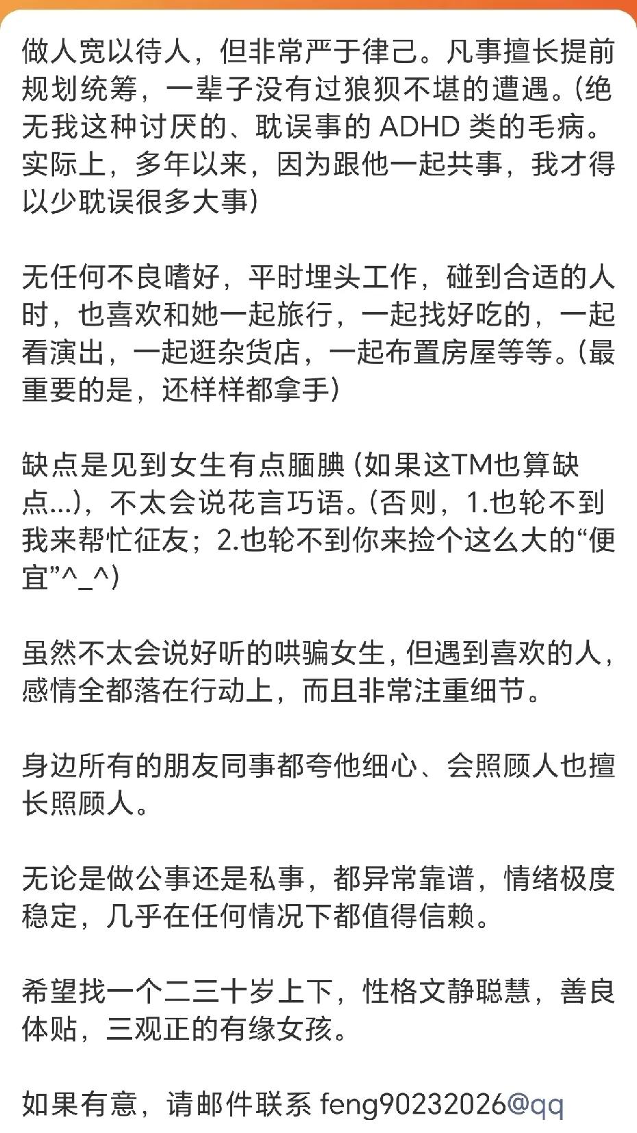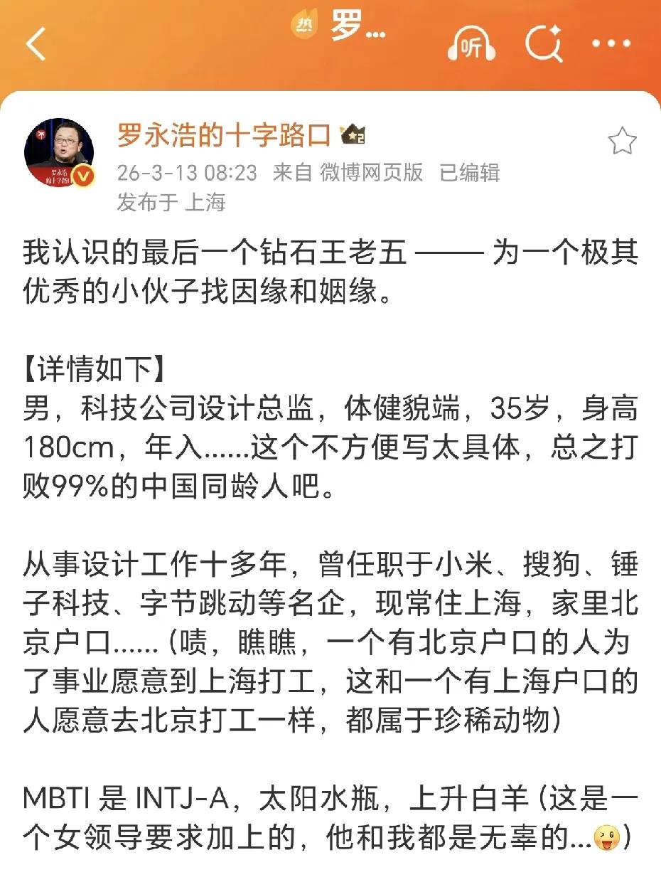 罗永浩征婚了 乍一看真以为罗永浩征婚了,罗永浩不是已经结婚了啊,难道离婚了?这么大张旗鼓征婚也有点符合他的风格,仔细一看,原来不是为自己征婚,是替原来的男下属征婚,他这下属35岁,180CM,北京户口,上海做设计工作,以前就职过很多大厂,锤子科技,小米,字节跳动,等等,能力应该很不错,就一点没说这男孩长的怎么样? 只说这男下属,见到女孩子害羞,那他在工作不是也接触女孩子呀,难道不说话吗?不过这男孩离职之后,还和原老板有联系,说明人品不错哦。 通过老罗这么一征婚,是不是邮箱的求爱信都爆了吧,会不会挑花眼呀,哈哈😃