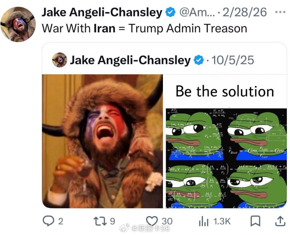 特朗普正在经历“脱粉”2020年1月,那名身穿牛头闯进白宫特朗普粉丝,曾多次称特朗普为“救世主”,为支持特朗普,他不惜冲击美国国会大厦,最终被判处三年多的监禁。如今也坚决反对特朗普这场莫名其妙的战争,如今美国人反对战争比例高达68%;当初特朗普对MAGA选民的核心诉求是“停止无休止的海外战争,专注国内经济”;在2024年竞选时反复承诺:“我将是和平缔造者,不再让美国孩子为外国流血!”《华盛顿邮报》3月8日统计调查近一半的MAGA选民认为特朗普“已背离初心”,违背了当年的承诺