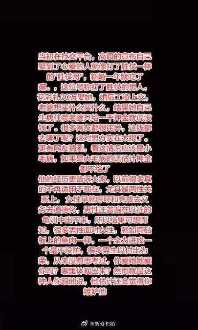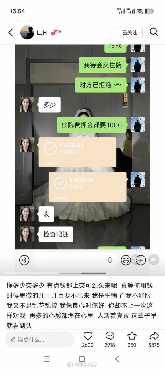 传说中的“胜仗”哥去年在新婚时高兴的发帖称娶了心爱的人就像打了一场胜仗,彩礼30万,工资上交结果自己生病要住院,磨叽半天,就要来1000的押金