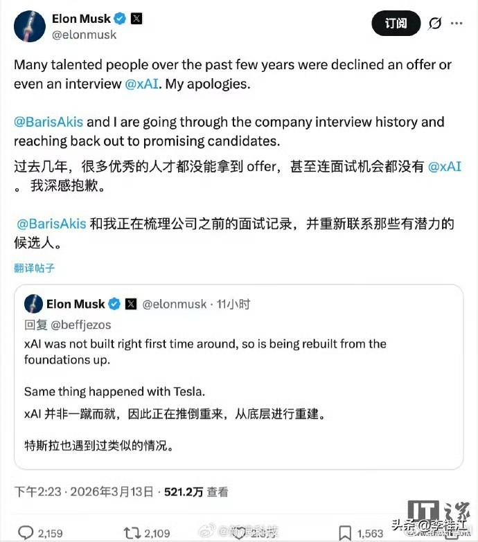 马斯克说:“过去几年里,很多有才华的人申请 xAI 时被拒绝,甚至没有获得面试机会。我对此表示抱歉。” 这样还有用吗?如不是因为多名核心员工和联合创始人相继离开,马斯克会这样说,和道歉吗? 可见在AI的竞争中,人才太重要了,也说明特斯拉的人才库也有危机了。