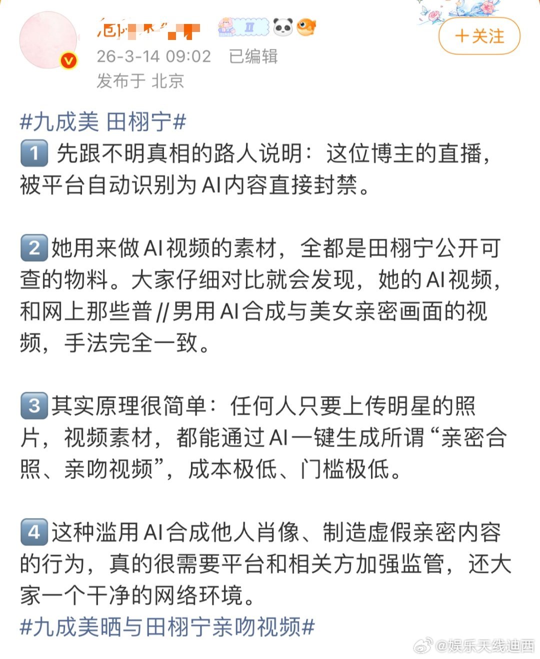九成美晒与田栩宁亲吻视频 九成美曝田栩宁出轨有孩子 从地库拍到牵手到今天网红直接爆恋爱接吻视频从若若到九成美不变的只有田栩宁粉丝说是ai生成
