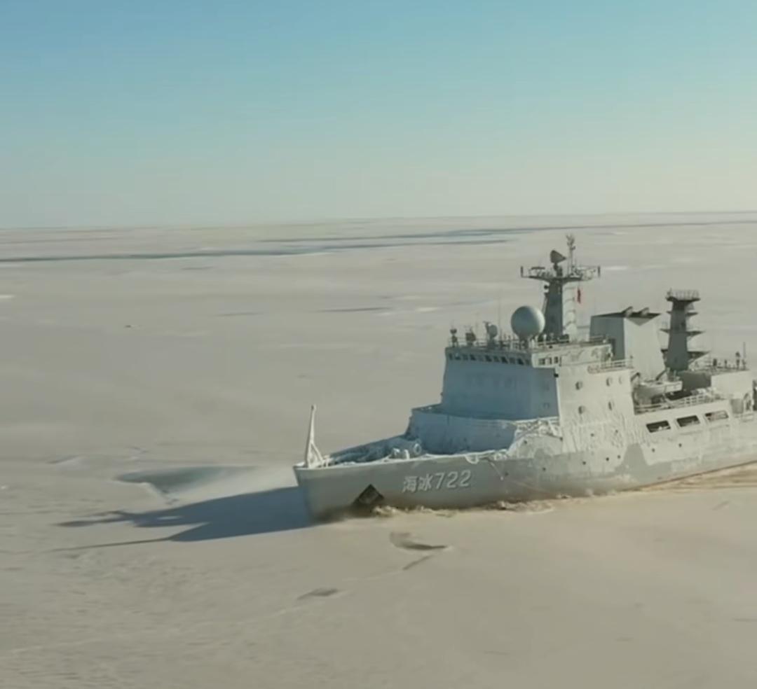 这是中国海军海冰722号破冰船,是我国自主设计建造的272型破冰船首舰,也是中国海军现役的第二代主力破冰船 。 该船2013年11月开工建造,2015年3月下水,2016年初正式入列服役。船长103.10米,宽18.40米,满载排水量4860吨,最大航速18节,可抗12级大风,续航力达到了7000海里;具备TC6级的破冰能力,可连续破除1米厚度的当年冰,极限破冰厚度1.2米,能在-30℃的极寒环境下稳定作业,还设有直升机起降平台,可搭载直-8直升机执行救援、投送任务。 它的主要用途是承担冬季渤海和黄海北部海域为主的冰情调查、破冰引航、海上冰区抢险救援等任务,是我国北方冬季港口通航、海上作业安全的核心保障力量,同时还可以执行海洋环境监测、人员物资运输、边防巡逻、试验保障、院校实习等多样化勤务任务。 “海冰722”这个舷号有着特殊的历史传承,第一代海冰722是1969年经周总理亲自批准紧急建造的我国首艘破冰船,安全服役了44年,于2013年光荣退役。新舰继承了这个舷号,延续了守护我国北方海域的使命。 画面中船身覆盖的冰层,是它在北方严寒海域执行冬季破冰任务时,海水飞溅到船体后快速冻结形成的。