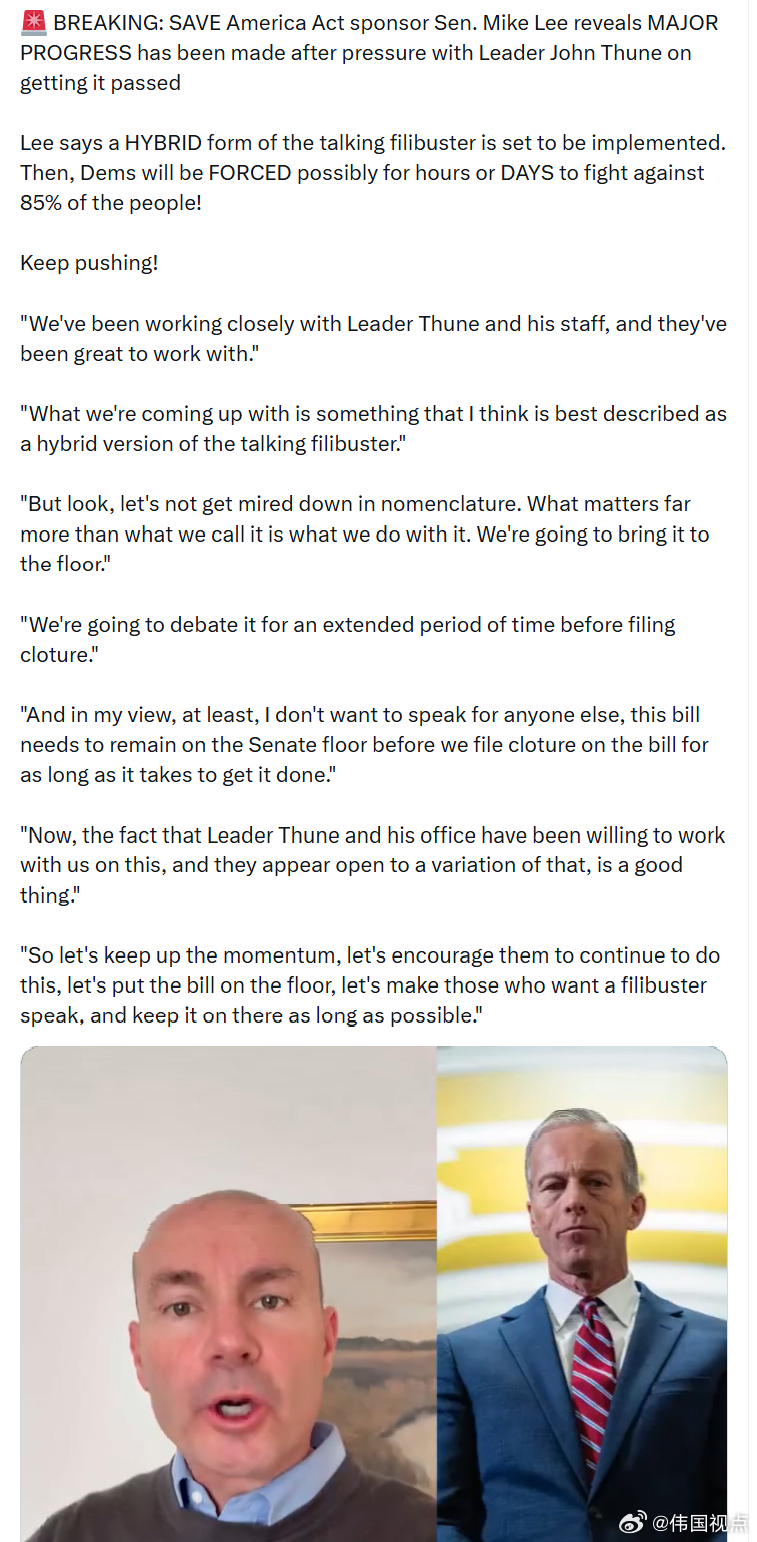 《拯救美国法案》发起人、参议员 迈克·李表示,在对参议院多数党领袖约翰·图恩及其团队施加压力后,该法案的推进取得了重大进展。