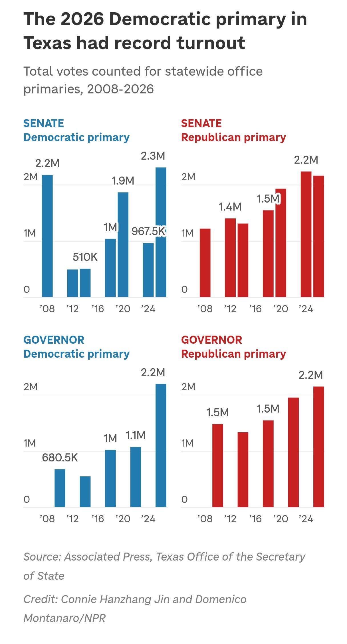 德克萨斯州民主党初选投票率创新高引发“翻蓝”讨论 近日公布的美国德克萨斯州初选投票数据显示,今年该州民主党参议员初选投票人数创下历史新高,超过230万选民参与投票。这一数字不仅刷新了该州历史上任何全州范围公职初选的投票纪录,也高于同期举行的共和党参议员初选的投票人数(近220万)。在民主党初选中,州众议员詹姆斯·塔拉里科击败了联邦众议员贾斯敏·克罗克特。 值得注意的是,此次民主党初选的投票人数甚至超过了2024年总统大选年该州共和党参议员初选的投票规模。分析指出,民主党初选的高投票率,反映了在当前中期选举年,该党支持者的政治热情显著上升。 除了整体投票率创新高,民主党在一些拉丁裔人口聚集的县也看到了积极信号。据美国全国公共广播公司对相关数据的分析,与2024年初选相比,今年该州拉丁裔人口占比超50%的十个大县中,民主党初选投票数平均增长了128%,而共和党初选投票数在这些县则平均下降了4.8%。这一变化与此前外界对拉丁裔选民政治倾向的观察形成对比。在2024年大选中,共和党候选人曾创下赢得拉丁裔选民票数的纪录。 尽管数据为民主党带来了希望,但在德克萨斯州实现政治版图“由红转蓝”,对民主党而言仍是一项艰巨挑战。自1994年以来,尚无民主党候选人在该州赢得全州性公职选举。近年来最接近的一次是2018年,当时民主党新秀贝托·奥罗克挑战共和党参议员特德·克鲁兹,最终以不到3个百分点的微弱差距落败。而奥罗克2022年转战州长选举,则以11个百分点的较大差距失利。 分析人士指出,初选的高参与度并不直接等同于大选的胜利。虽然人口结构变化,尤其是拉丁裔和亚裔人口的增长,使德克萨斯州成为全美七个“少数族裔占多数”的州之一,为民主党提供了长期机遇,但选民投票率的最终转化以及竞选议题的吸引力,才是决定大选结果的关键。未来,该州能否成为民主党争夺参议院控制权的新战场,仍有待进一步观察。