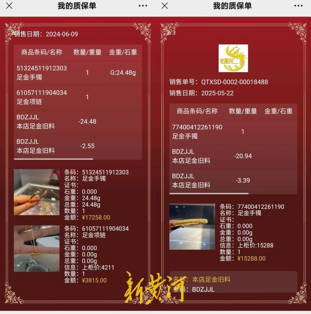 无独有偶,湖南永州邓先生的母亲也陷入了老凤祥的“置换迷局”。邓先生告诉记者,其母亲最初在永州市冷水滩区老凤祥金水湾店购买了一只27.03克的金手镯。2024年,在门店店员的建议下,老人选择以旧换新。第一次置换时,27.03克的旧镯被换成24余克的新镯,和一条未知克重的项链,旧金剩余的2.5克抵扣了部分费用,并补款3880元。第二次置换,因配饰项链断裂,老人再次前往门店,最终将24余克的手镯换成了一只空心手镯,同时将断裂项链换成6克的新项链。此次置换,老人又补付了4500元。