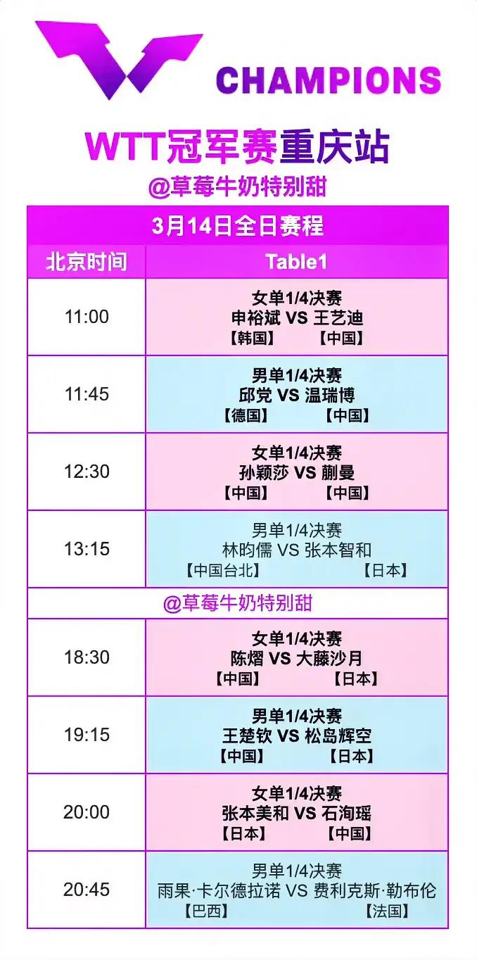 央视体育两个频道都没有播王艺迪和申裕斌的1/4决赛!! 今天的1/4决赛,温瑞博,石洵瑶基本上都要止步乒球重庆冠军赛4强之外了! 王艺迪现在打球完全依靠的是心情,若果心情大好,还有把握胜状态十分爆棚的申裕斌!否则!根据前两局王艺迪11:7,11:5速胜,看来王艺迪今天心情大好!! 蒯曼就看临场发挥了,还看有没有外在因素的干扰了,若果双方都遵循纯粹的体育精神,尊重自己,尊重对方,尊重观众,十有八九是蒯曼出局! 王楚钦,陈熠都是抗日,基本上都是硬拚,王楚钦胜率大一些,因王楚钦憋着一口气,要报前一次的一箭之仇! 陈熠打球软绵绵的,看看是否能以软绵绵之力,磨掉状态一片大好,想乘胜追击,还想胜的大藤沙月之硬力! 若果蒯曼止步4强之外,陈熠进入四强,她俩的世排名是否有变化呢! 今天的决赛,十分精彩,也十分期待!
