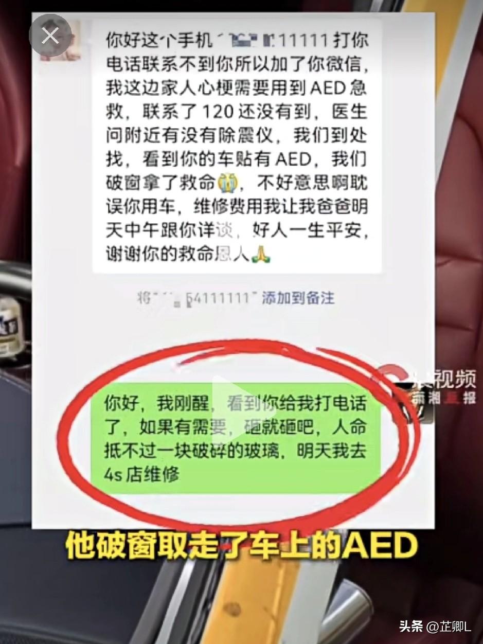 人命大过天!山东威海一幕看哭无数人:为救人砸车,车主:随便砸! 山东威海,最近发生了一件又惊险又暖心的大事! 一位市民家里人突然心梗,情况特别危急,必须马上用AED救命。 他四处寻找,正好看到一辆私家车上面贴着AED标识,赶紧打电话给车主,可一直没人接。 救人刻不容缓! 情急之下,他咬咬牙,直接砸开车窗,拿走AED,成功把家人从鬼门关拉了回来。 事后他心里特别过意不去,主动添加了车主微信,想要赔偿。 可车主李先生的一番话,直接让所有人破防: “我看到未接来电了,真要是救人,砸就砸吧!一块玻璃而已,哪有人命重要!” 原来这台AED是李先生自己花钱装的,刚装上不过两个月,居然就真的救了人。 他还说:希望大家都能备上,但希望永远都用不上。 一边是果断救人的家属,一边是格局超大的车主。 这才是普通人身上最亮的光,这才是中国人最实在的善良! 为威海好人点赞! 素材来源:潇湘晨报,侵联删!