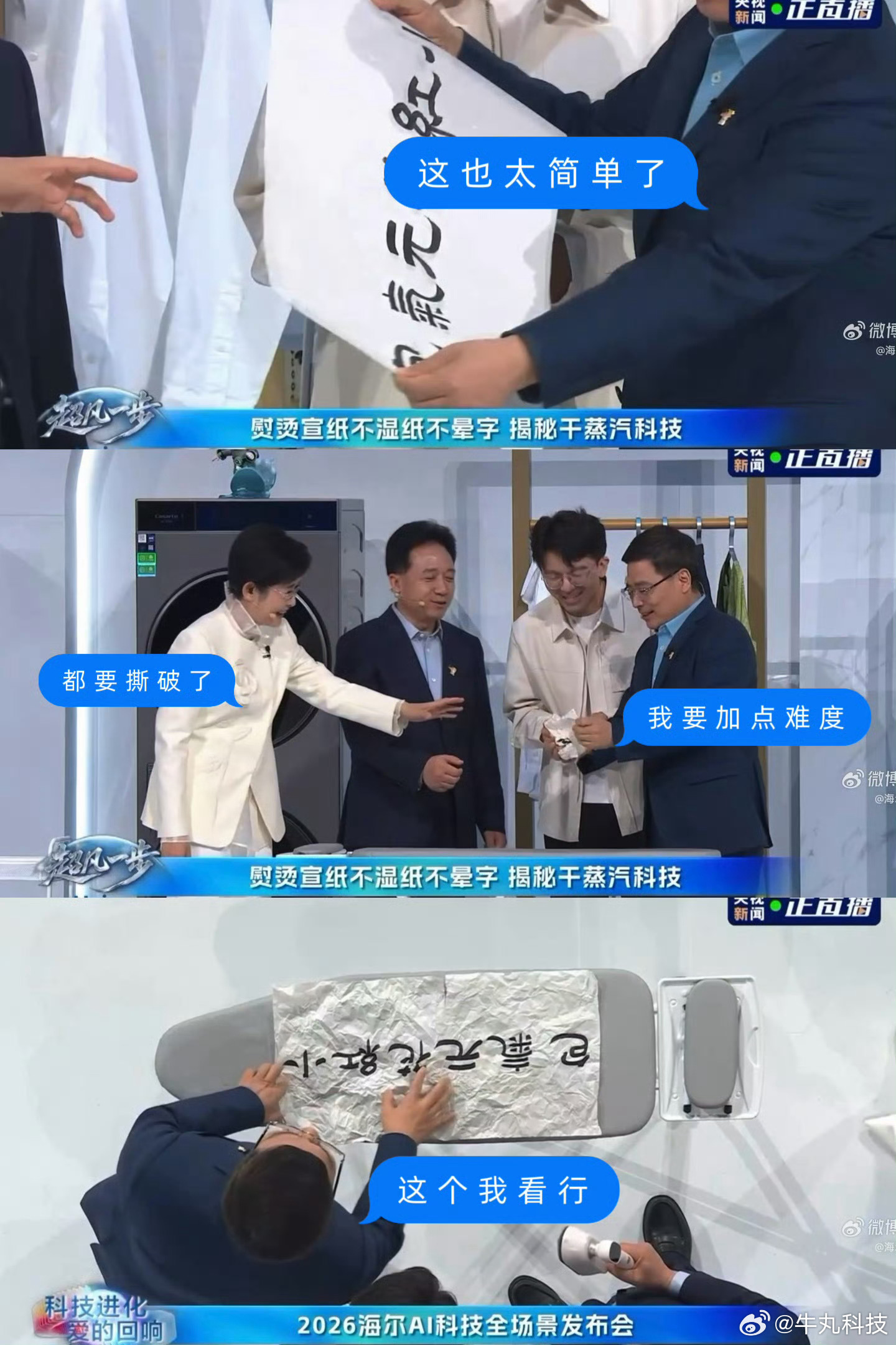 昨晚海尔发布会全程看完,只能说周云杰家电界最严厉的父亲!对自家产品是真严格啊,现场测温四筒洗衣机的时候,本来介绍得好好的,周总直接让:“加点再加点”!到AI熨烫机的时候,毕导刚拿出崭新的宣纸,周总亲自上手把纸都给揉烂了,让重新熨试试!看得出周总对产品是真了解,知道自家产品的性能极限在哪儿!讲真,一个公司大老板对自家产品如此了解的,非常少见!又一次被周总圈粉了!周云杰加点再加点揉揉再揉揉