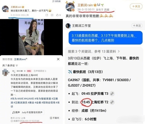 王鹤润被拍到在13号下午15:37出席上海活动,而西藏飞上海的航班基本仅有9:35—15:30这趟稍微贴近,但如果是这趟航班,根本抵达活动现场了。也就是说王鹤润在吐槽王玉雯的时候已经在上海了,即很有可能是王鹤润本人发的吐槽评论,而后挂🪜伪装成还在上西藏,让工作人员背锅。