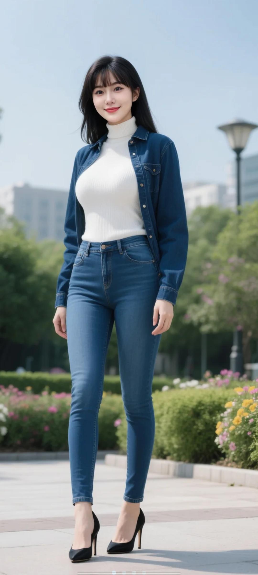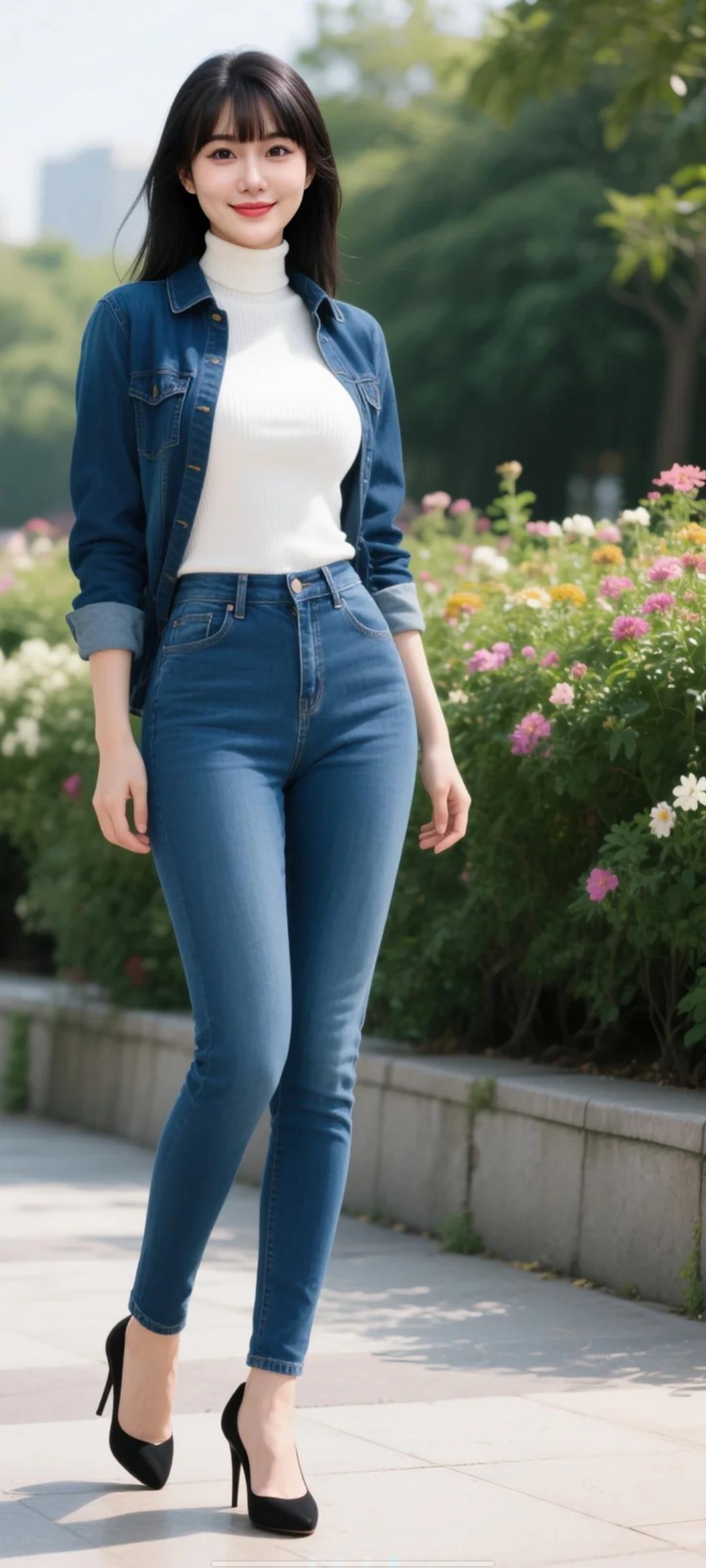 宝子们啊,快看啊, 这位美女穿着牛仔外套,走在公园里。