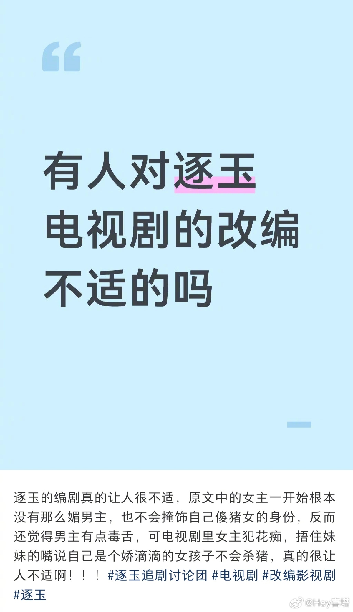 逐玉被🍠人喷惨了逐玉各大主流媒体评价一个南极一个北极,两极分化严重。这边一片祥和,🍠那边被骂惨了。主要观点有,给男主辅酶,削弱女主,剧情封/建,女主被当摄像头,男主卖肉那段是吐槽重灾区,女主杀猪妹身份被削……🎶人倒是只吃颜值,切片视频都是夸帅的,剧情讨论偏少,目前看到18集,个人感觉可看性颜值>剧情。只吃帅哥美女的话可以看得很开心p1-7🍠评价p8-9🎶评价各位都看了吗?评论区可以分享下逐玉官方