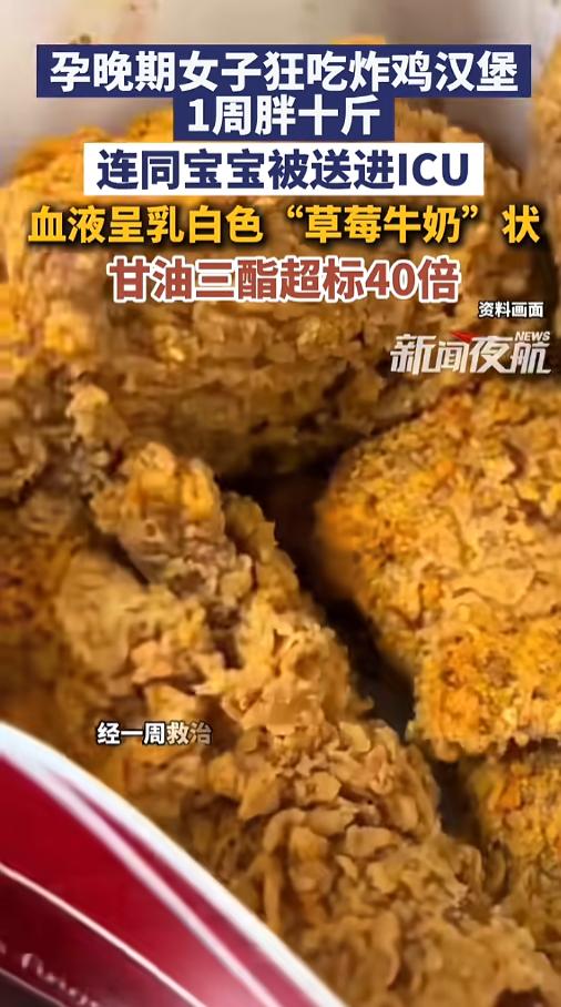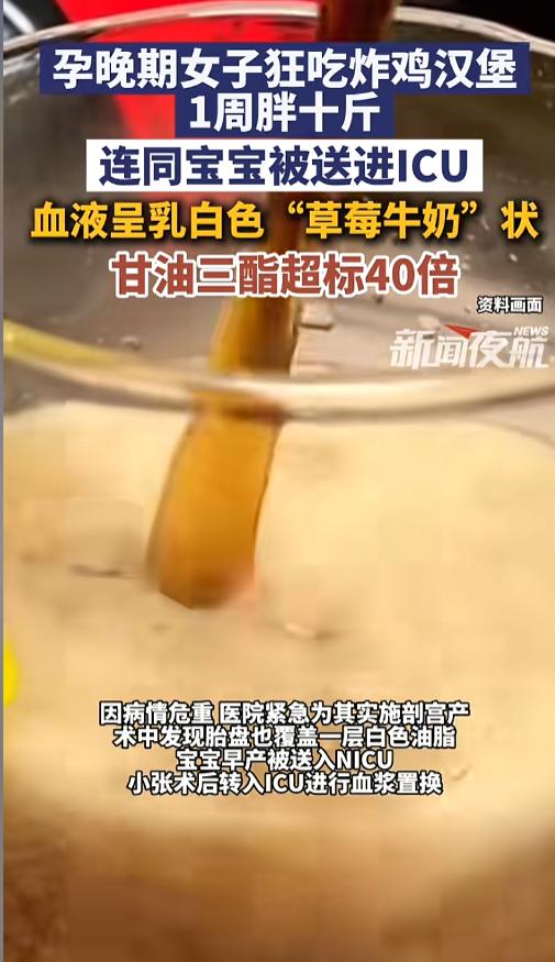 “可长点心吧!”近日,浙江杭州,一女子在孕晚期,疏忽了自己的饮食,开始狂吃可乐汉堡,一周之内竟然胖了10斤。随后,女子因腹痛就医,竟然还出现了“牛奶血”。女子紧急进行了剖宫产,和宝宝一起进了ICU。网友:怀孕了怎么还能胡乱吃呢? 孕妈妈在怀孕期间,都会想办法控制自己的饮食,让自己吃的更健康,以期让自己的宝宝能健康的出生。不过这根弦绷的太直也不好,有可能绷不住引起逆反。 据媒体3月13日报道,小张今年28岁,怀孕期间一直比较注意自己的饮食,到了孕晚期35周的时候,她觉得已经这么久了,稍微吃点好的也不要紧。 就这样,她放松了自己的饮食管理,每天都吃些炸鸡汉堡,还喜欢上了红烧肉,每天都要吃不少。一周的时间里,小张胖的十来斤。 随后,小张因为腹痛就医。检查发现,她的身体出现了大问题,根本不是普通的肚子疼,而是高脂血症性胰腺炎,自己的甘油三酯含量超标近40倍,血液也成了牛奶血。 因为她的病症实在太严重,医生紧急安排了剖宫产,连宝宝的胎盘上都盖了一层油脂。好在手术非常成功,小张和宝宝在ICU里治疗了几天,就顺利出院了。 网友看后表示,行百里者半九十,最后的疏忽让一切努力都白费了!大家一定要引以为戒,坚持,坚持,还是坚持!直到走向最终的胜利! 信息来源:《3月13日(发布),孕晚期女子狂吃炸鸡汉堡1周胖十斤,连同宝宝被送进ICU,血液呈乳白色“草莓牛奶”状,甘油三酯超标40倍。》新闻夜航
