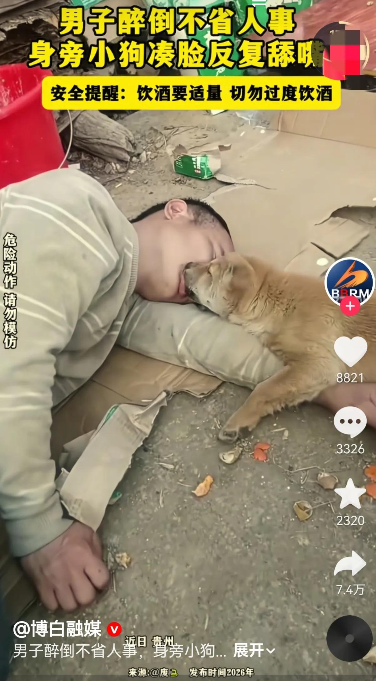 一年轻男子喝醉酒,躺地上睡的不省人事,狗狗挨近男子反复舔嘴,男子仍然没有任何反应。 提醒广大酒民,喝小酒怡情,喝多了伤身伤命。