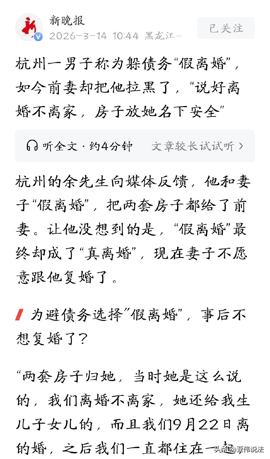 二婚还敢这么玩!浙江杭州,男子花20多万娶二婚妻子回家,婚后,妻子说心里有阴影,两人一直分房睡。男子虽然心有怨言,但刚好赶上妻子家拆迁,他也分到了80平房子,也算一种心里安慰。事后,男子欠了银行11万,为了躲避债务,妻子提出假离婚,离婚不离家,房子暂时放她名下,以后留给孩子。男子信以为真,将两套房都给了妻子,万万没想到,这竟是一个圈套,妻子将他赶出家门并拉黑。 44岁的余先生走投无路,他一根接一根抽烟,手机里,前妻的微信头像已经点不开了,电话也不接。 三个月前,他们还在一个屋檐下生活,现在,自己却连门都进不去,他越想越气,自己竟被前妻摆了一道。 2022年,余先生经人介绍认识了沈女士,俩人都二婚,见面没几个月就领了证。 余先生挺实诚,掏了16万8彩礼,又花5万多买三金,合计20多万砸进去。他是真心想过日子的,经历过一次失败的婚姻,他就想有个知冷知热的人。 可结婚当天,沈女士就把话挑明了∶我对婚姻生活有阴影,暂时不能同房,你得等。 余先生愣了一会儿,最后还是点了头,等就等吧,人家离过婚有心理创伤,得理解,反正领了证就是一家人,来日方长。 婚后,正赶上沈女士家那边拆迁,户口落地就有房,他便果断把户口迁到妻子家。 当时分了三套,沈女士前夫拿走一套,剩下两套归他们,按人头,老余名下能占80平。 他心里还挺美,觉得这媳妇娶对了。 日子就这么过着,表面上是两口子,实际各睡各的,沈女士住主卧,他睡次卧,比合租室友还客气。 她从不让他碰,他也不强求,有时候老母亲打电话问,咋还不要孩子?他就含糊过去,说快了快了。 虽然余先生心里觉得委屈,这算哪门子夫妻,但转念一想,户口落了,房子也有了,人也天天见面,总比一个人强。 直到2024年,余先生那边出了事。 原来,之前他在老家银行借了11万,给老母亲看病和供女儿读书用的。母亲病好了,债却还不上了。 2025年7月,法院催他还钱,银行天天打电话,说再不还就要强制执行,但他确实拿不出来。 妻子知道后,非常生气,马上召开了一次家庭会议。 丈母娘给出两个主意:一个是我们凑点钱帮你还上,另一个是他俩先假装离婚,将房子挪到妻子名下,撇清债务关系。 余先生当时很犹豫,他也知道转移资产逃避债务不地道,但在金钱面前,这些正义感一文不值。 而且妻子一再保证,他俩是假离婚,离婚不离家,房子暂时放她那儿,以后两人生儿育女了,就留给孩子。 余先生一听生孩子这话,立马高兴了,2025年9月22号,俩人办了离婚手续,两套房全归沈女士。 办完证,俩人照常住一块儿,余先生也没觉得有什么不对劲。 可直到今年1月23号晚上,他才明白过来。 那天他收到法院执行令,心里发慌,回家跟沈女士商量,能不能把她妈妈当年送的那条项链卖了,先把债顶上。 沈女士当场翻脸,两人大吵一架,吵到最后,沈女士直接把他赶出门。 余先生后来回去找过她两次,沈女士都报了警,说他纠缠,再后来,微信也被拉黑了。 余先生这才回过味来,那场家庭会议,那两个方案,还有那句信誓旦旦的离婚不离家,全是给他下的套。 房子落她名下就没打算还,人也从来没打算跟他过。 三年多夫妻,他没碰过她一根手指头,彩礼三金二十多万,全打了水漂,本来属于他的80平米的房子,他却连门都进不去。 同床共枕的人,硬生生自己算计了个一干二净。 《民法典》第538条规定∶债务人以放弃其债权、放弃债权担保、无偿转让财产等方式无偿处分财产权益,或者恶意延长其到期债权的履行期限,影响债权人的债权实现的,债权人可以请求人民法院撤销债务人的行为。 余先生为逃避11万银行债务,与沈女士协议离婚并将两套房产全部无偿转让给沈女士。 该行为属于以无偿处分财产方式逃避债务,直接导致其无财产可供执行,严重损害银行的债权实现。 沈女士明知余先生负债仍配合转移财产,主观存在恶意。 银行作为债权人,可请求法院撤销离婚协议中,全部房产归沈女士的财产分割条款,恢复房产的可执行状态。 余先生可主张欺诈撤销离婚财产约定,请求重新分割夫妻共同财产。