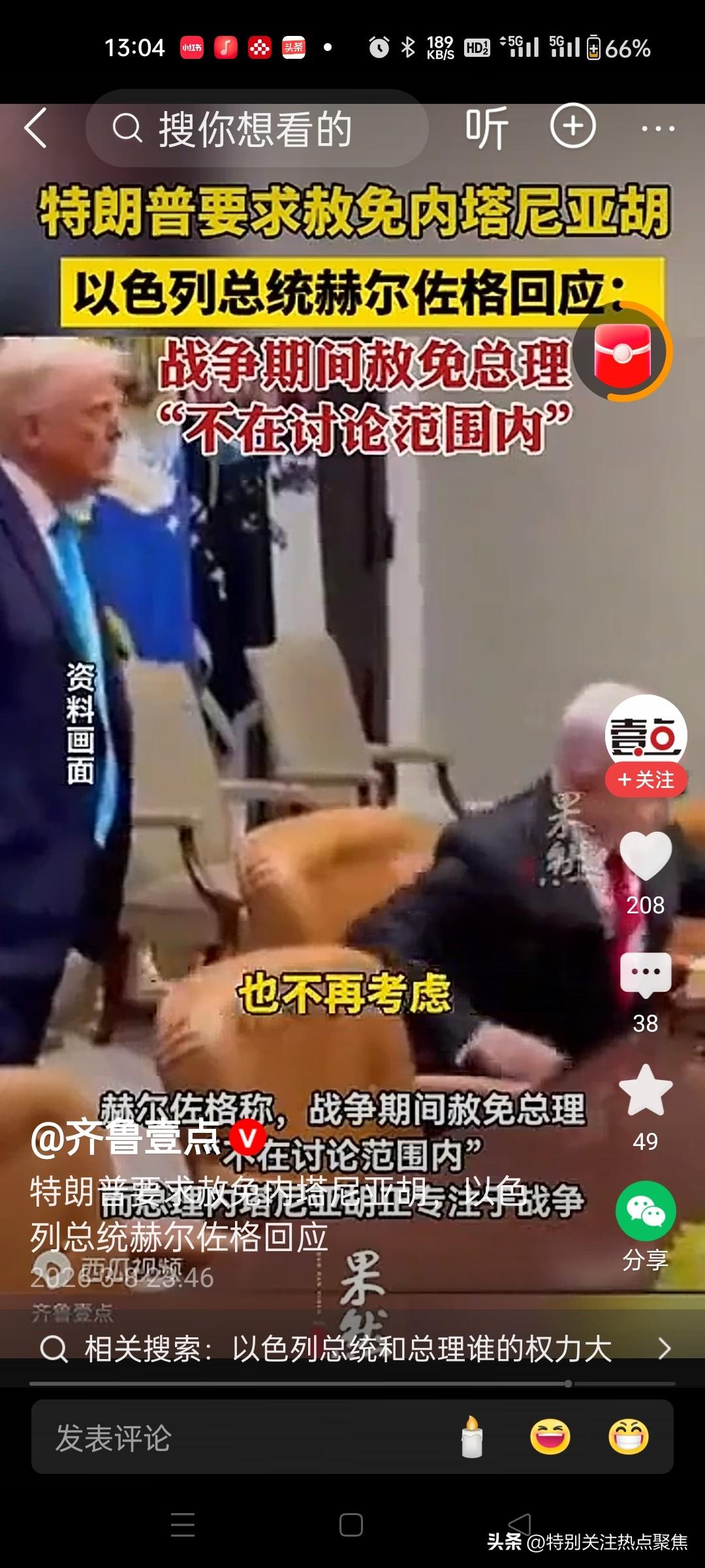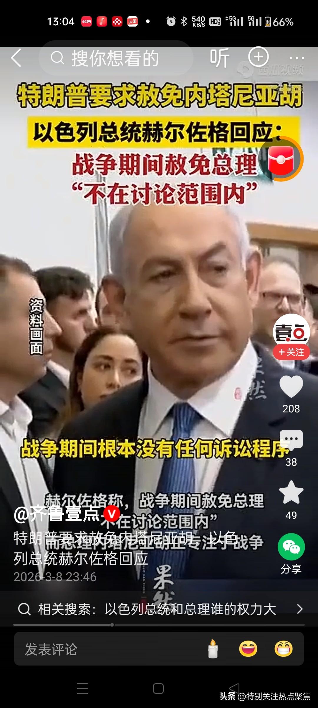 不识好歹的以色列总统说特朗普侵犯以色列主权 前几天还说尊重特朗普总统。 特朗普为以色列做了什么世界上的人都看得明明白白。 以色列总统赫尔佐格3月13日却表示,美国总统特朗普针对其处理以色列总理内塔尼亚胡赦免问题的批评性言论,是对以色列国家治理象征和主权的“公然攻击”。 特朗普提议一下,评论一下,你走你的法律程序,他也干预不了,哪门子攻击主权。 这个总统也是个摆设,打仗都是总理内塔尼亚胡在吆喝。