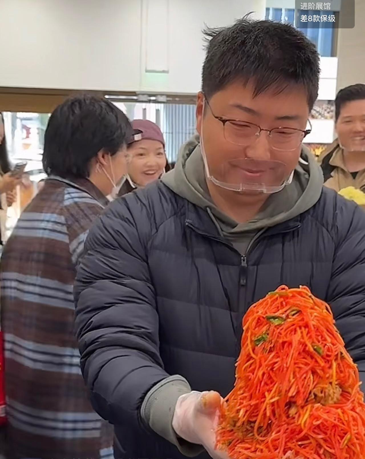 西安菜夹馍大赛,冠军选手应该已经出现。 这位眼镜哥以绝对优势力压众人,馍在他手里直接成了盘子,夹的菜品最后称重为1760克,足足三斤多。 放眼望去,全是胡萝卜丝,这个“巨无霸”菜夹馍要是吃进肚,脸估计都要黄三天。