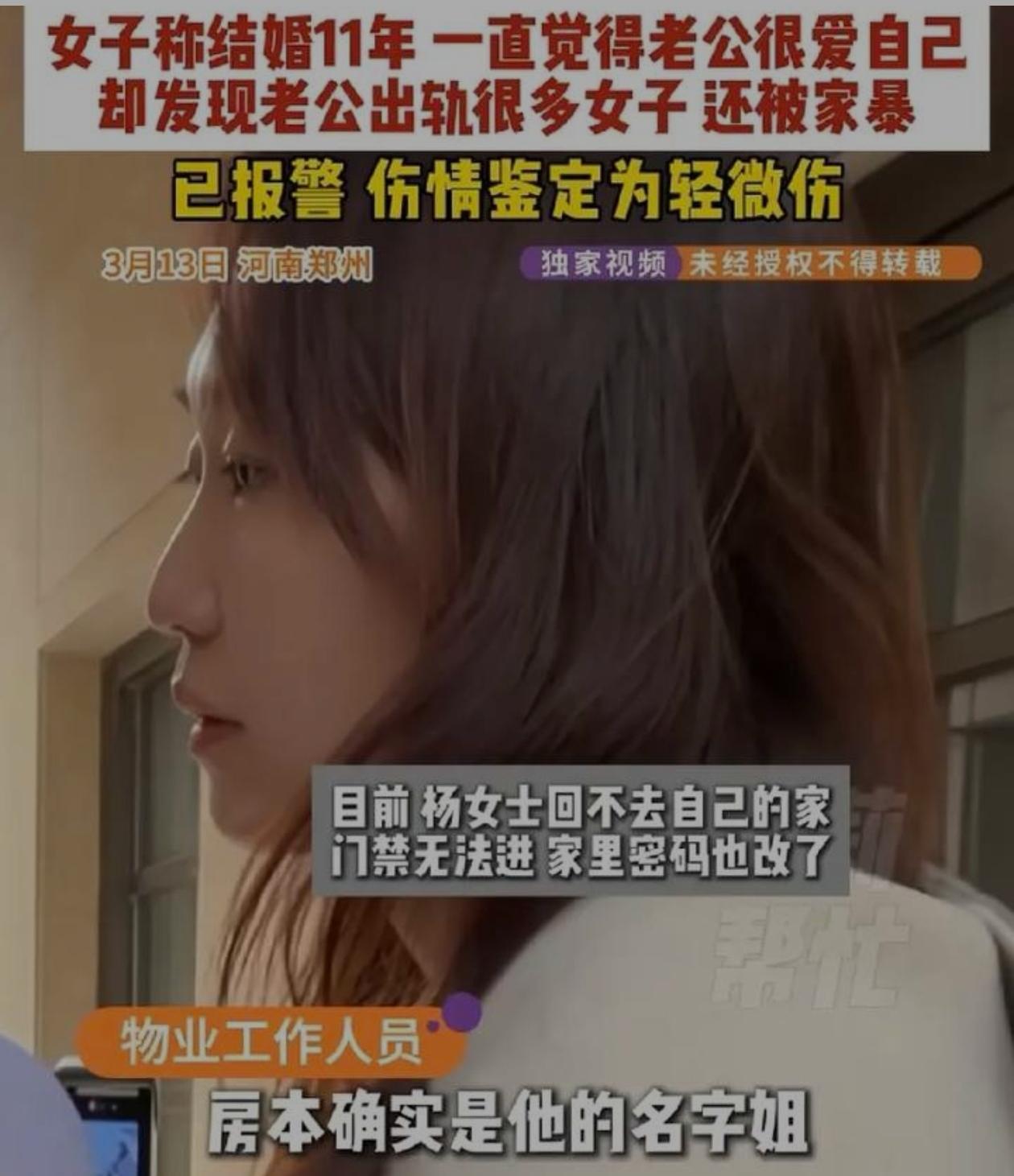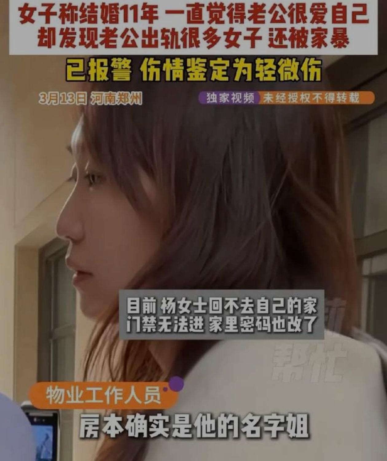 郑州豪门婚姻彻底破碎,优秀女子惨遭出轨家暴还被换锁赶出家门。 (个人观点仅供参考,无任何不良引导) 杨女士外形靓丽能力出众,面对不堪的婚姻现状只能向媒体寻求帮助。她与丈夫留学期间相识相伴,携手走过整整十一个春秋。丈夫生长在高知家庭,家境殷实富足。一家人居住在豪华别墅之中,三位保姆全程照料全家生活。她为丈夫生育三个可爱的孩子,曾经的五口之家羡煞旁人。 杨女士职场表现十分亮眼。她带领销售部门创下两亿多元的销售总额。她悉心照料家中老小,对家庭付出全部心血。她始终坚守对爱情的初心,却不知美好婚姻早已沦为假象。 去年的意外发现打碎所有幻想。丈夫私藏专用手机联络数十位异性。出轨行为早已是人尽皆知的秘密。唯独杨女士一人被彻底蒙在鼓里。 丈夫面对指责毫无悔改之意。他公然宣扬男人在外寻欢作乐的荒谬言论。他与婚外异性定下不干涉家庭的无耻约定。 争执之中丈夫露出狰狞面目。掌掴撕扯等暴力行为接连发生。恶意推搡致使杨女士滚落楼梯。女儿紧急拨打急救电话才化解危机。 杨女士念及骨肉亲情选择隐忍退让。她满心期盼丈夫能够回心转意。短暂离家后的归家之路却被彻底阻断。别墅门锁密码被私自更换。 丈夫面对质问百般抵赖换锁事实。他全程保持冷漠敷衍的态度。他直接向法院提起诉讼等待法律裁决。 三观不合的婚姻从无幸福可言。杨女士坚守忠诚纯粹的情感追求。丈夫秉持自私放纵的扭曲观念。卑微将就换不来半点珍惜与尊重。 杨女士具备独立生活的过硬实力。她完全有底气告别错误的过往。及时止损才是对自己最好的保护。真心要留给懂得珍惜的人。自爱自立永远是女性立足世间的根本。 图片素材来自网络,无任何不良引导。