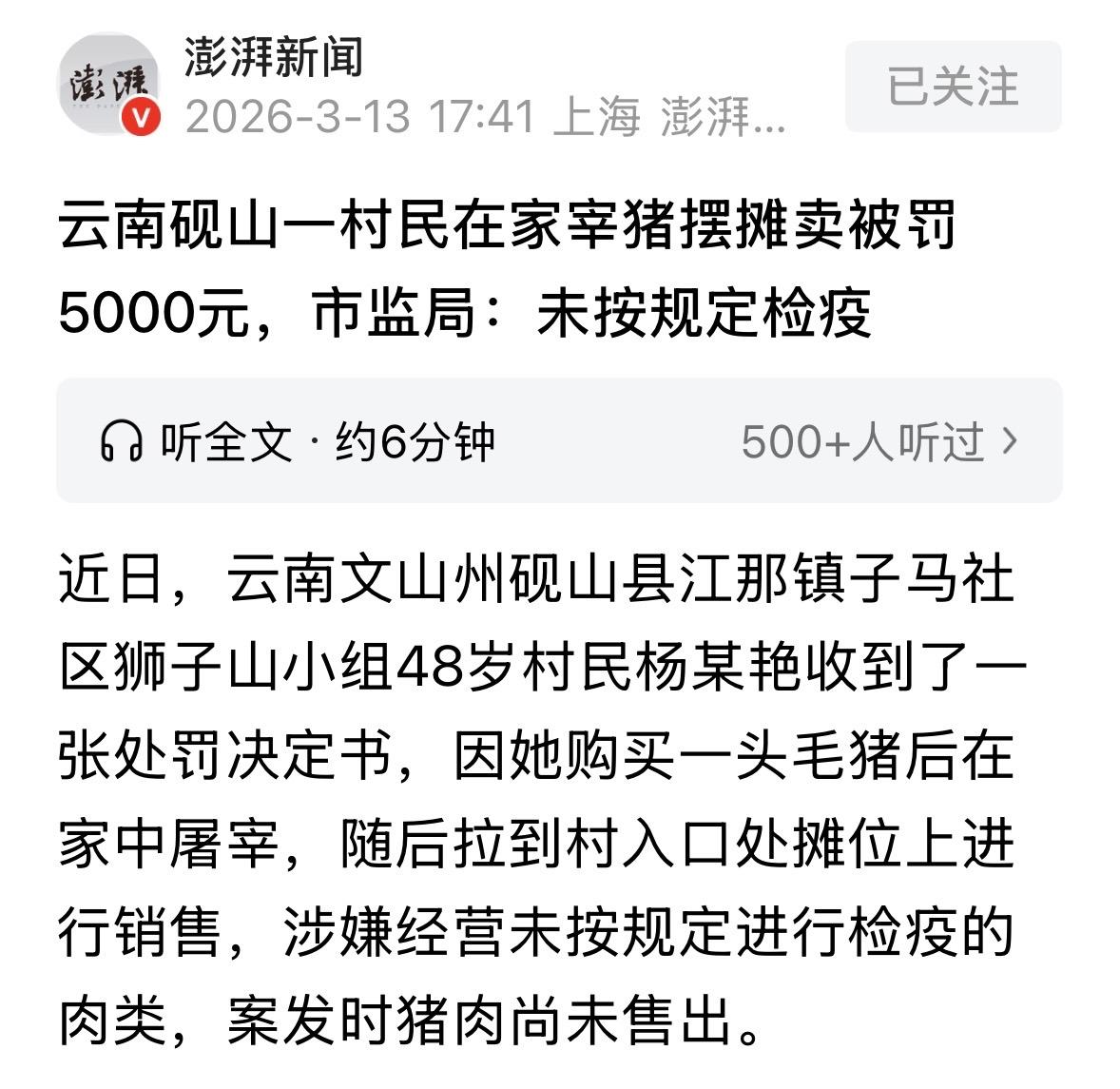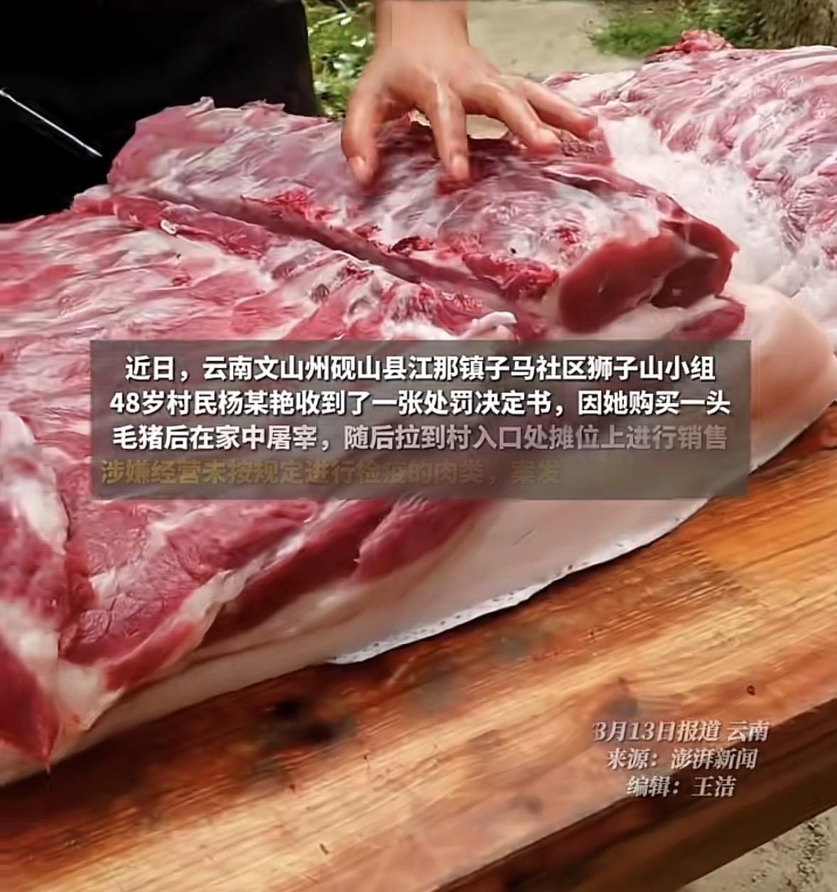 云南,女子买了头毛猪,在家里宰完,她自留了16斤,剩下的340多斤则拉到摊位上,准备以10块5一斤卖出去,赚个3000多块钱补贴家用,谁料,猪肉还没卖出去,执法人员先一步赶到现场,以女子涉嫌经营未按规定进行检疫的肉类为由,没收了所有猪肉,并罚款5000块。这下女子傻眼了。 2026年1月12号,杨某艳眼看快过年了,她想着倒腾一头猪,自己家里吃肉方便,剩下的还能摆个摊赚点零花钱补贴家用。 第二天一大早,天刚蒙蒙亮,她就在自家院子里动了手。 这头毛猪是她从生猪市场买来的,经过一番宰杀,变成了大约358斤多的鲜猪肉。 她留了16斤左右给自家过年包饺子、炖红烧肉,剩下的340多斤,她全装上了三轮车,拉到了村口处的摊位上。 杨某艳坐在摊位前,看着案板上摆得满满当当的肉,期待能快点卖光,把钱挣进兜里。 她准备按10块5一斤卖出去,这样算下来能卖3000多。对于她家来说,这已经是一笔不小的数目。 不过,杨某艳忽略了很重要的一点。 这猪是她自己杀的,没经过正规部门检查,既没有检疫合格证明,肉皮上也没盖那个蓝色的“检疫讫”印章。 她甚至连个卖肉的账本都没准备,想着卖一笔是一笔,钱揣兜里最实在。 然而,就在她摆好摊,还没来得及开张吆喝的时候,执法人员到了。 现场的气氛瞬间凝固。执法人员一眼就看出了问题。 案板上的猪肉光溜溜的,没有任何检验合格的印章,杨某艳也拿不出《动物检疫合格证明》和《肉品品质检验合格证》。 面对询问,杨某艳慌了神,只能老实交代,说还没卖出去呢,刚摆上,一斤都没卖。 执法人员当场对涉案猪肉进行了清点核算:剩下的鲜猪肉足足有358.8市斤,包含自留后用于销售的部分。 按她心里定的10.50元一斤算,这一堆肉的货值达到了3767.40元。 虽然一分钱还没赚到,但违法的事已经板上钉钉。她经营未按规定检疫的肉类,违法事实清楚。 案子很快进入了处罚程序。按照《食品安全法》第123条的规定,这属于严重违法行为。起步价就是10万元以上、15万元以下的罚款! 如果严格按法条走,杨某艳不仅要面临巨额罚款,还得被拘留,甚至可能因为交不起罚款而面临更严重的后果。 杨某艳吓坏了。她只是个小摊贩,家里条件本来就不好,她的孩子更是患有先天性心脏病,处处需要用钱。 3000多块钱的货值,要是罚十几万,这日子就彻底没法过了。 她在接受调查时,反复强调自己不懂那些,还是初犯,也是为了生活所迫,且肉还没卖出去,没造成实际危害,希望能从轻处理。 相关部门在审理时也很头疼。 一方面是严肃的食品安全法律,另一方面是底层百姓的生计困难。 执法人员调查发现,杨某艳确实属于小摊贩,家里困难的情况也属实,违法行为轻微,且未造成危害后果,货值金额也不高。 最终,市监局在法律允许的范围内,做出了“减轻处罚”的决定。 虽然依旧认定杨某艳违反了《食品安全法》第34条第8项的规定:禁止经营未按规定进行检疫的肉类,但考虑到她的特殊情况,没有按照最低10万元标准进行处罚。 最终,相关部门依法没收涉案342.8市斤猪肉,并对杨某艳作出5000元的罚款。 这起案件给所有像杨某艳这样的小商贩敲响了警钟:生活虽然不易,但食品安全的底线不能踩。 哪怕是为了省点检疫费,哪怕是为了多赚几百块钱,一旦触碰法律红线,付出的代价可能远超想象。 其实按规矩,卖没检疫的肉确实该重罚,毕竟食品安全是天大的事,万一吃出病来谁负责? 法律定个10万起步的罚款,就是为了震慑那些黑心商家,让他们不敢乱来。 但杨某艳这种情况又不一样,她就是个为了生计的小摊贩,不是专门搞黑心肉的,而且肉还没卖出去,没真害到人。 要是真按最低标准罚10万,不仅她家里日子没法过,法律也会显得太冷冰冰。 所以相关部门最后“减轻处罚”是明智的,既没放过违法行为,给了个教训,又没把人往死里逼。 对此,你怎么看? 关注@运良说法 学法律知识不迷路