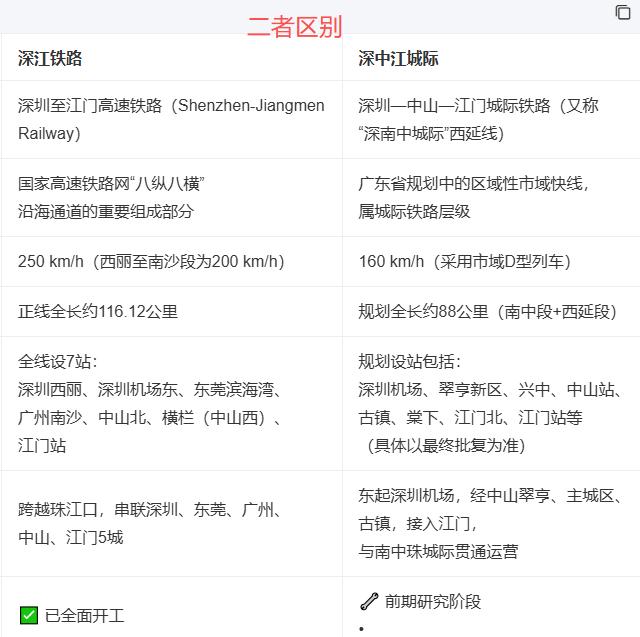 深江高铁2028年开通,江门又开始谋划深中江城际项目,江门的轨道交通将迎来大爆发! 1.深江高速铁路预计2028年建成通车,将显著提升江门在粤港澳大湾区的交通枢纽地位,而深中江城际作为前瞻性规划项目,正逐步推进前期研究,两者协同发力,有望推动江门轨道交通进入新一轮发展快车道。 2.深中江城际项目已进入谋划阶段,该项目拟从深圳机场引出,经中山翠亨新区、古镇,在中山站衔接南中珠城际,并延伸至江门棠下、江门站。可实现与南中珠城际、广佛江珠城际等线路换乘,强化江门与广州南沙、深圳前海的快速联系;目前处于规划方案研究阶段,尚未纳入国家批复的城际铁路建设规划,但江门市已委托设计单位开展前期研究。 3.这一“高铁+城际”双轮驱动格局,意味着江门将深度融入“轨道上的大湾区”,实现与深圳、广州、珠海等核心城市1小时通达; 以江门站为核心,形成辐射粤西、连接大西南的区域性综合交通枢纽。