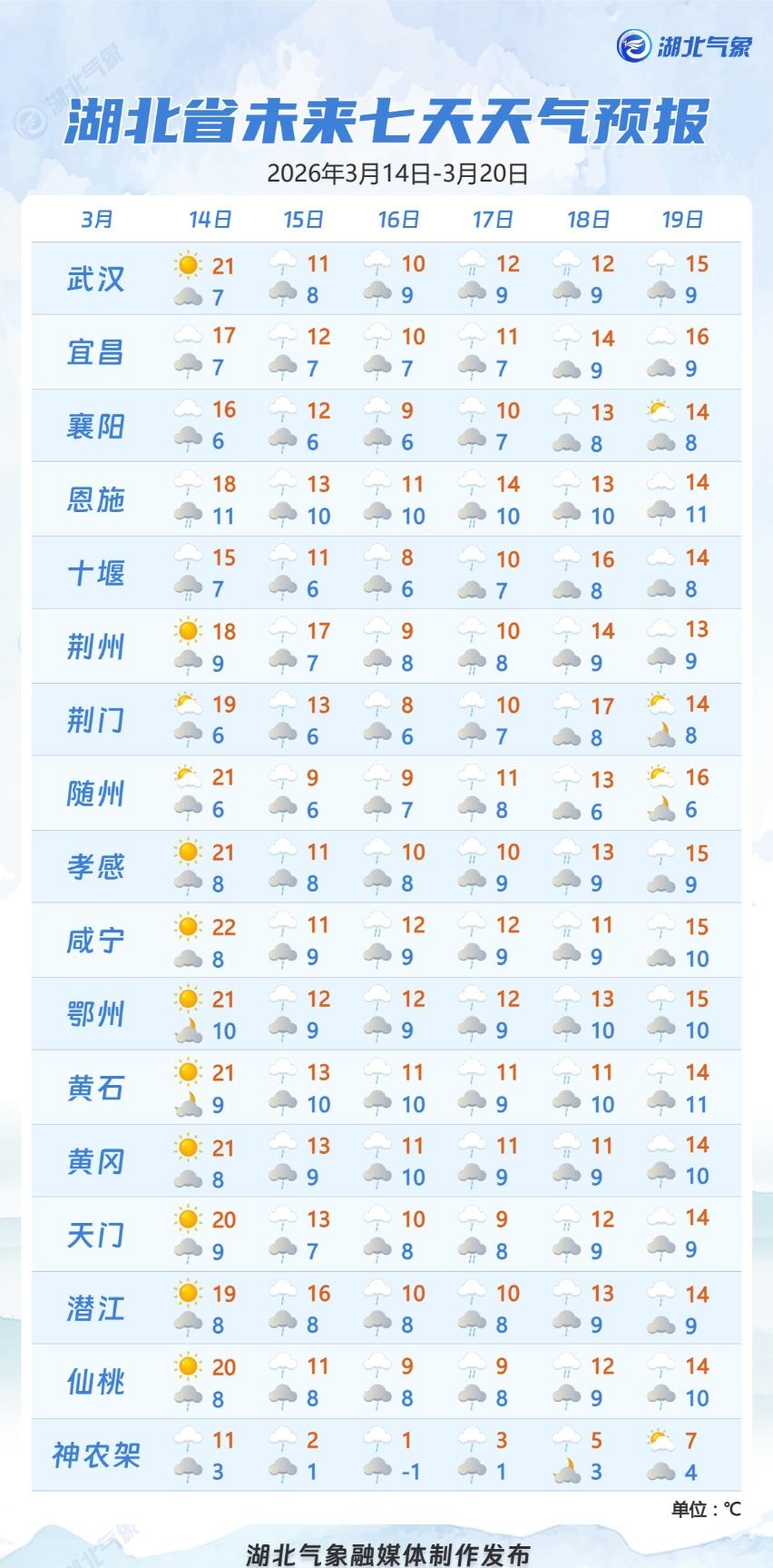 【湖北降雨降温大风齐上阵】湖北的天气又要变变变随着一股“全能型”冷空气东移南下,我省晴暖的天气格局将迎来转折⬇️ 我省将自西向东出现降雨降温,周六鄂西有小到中雨,局地大雨。鄂西北高海拔地区有雨夹雪或雪,其他大部地区白天以晴天到多云为主,夜间将逐步转为小雨。大家可以趁着雨水到来之,前外出踏青赏花~