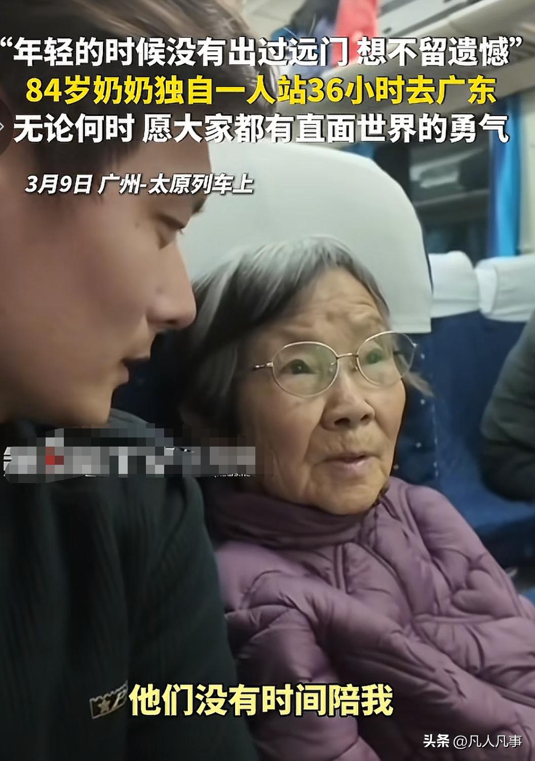 一个老奶奶,独自坐在广州到太原的火车上。经了解,这个奶奶已经84岁了,她是一个人从太原到广州去旅行的。其实说旅行谈不上,她说自己一辈子没出过远门,现在老了,想在去世之前看看外面的世界。她出门的时候,是年后返程打工的高峰,只买到站票。从太原到广州的36个小时,基本都站着过来的。到了广州之后,因为不熟悉路,也不知道该去哪里玩,于是只是在火车站附近逛了两天。在她一个人漫无目的地闲逛的时候,被一个自愿者发现。此时她身上已经没什么钱了,于是救助者给她买了回太原的火车票,还给买了几包路上吃的方便面。她说自己的儿子在去年脑梗去世了,有三个孙子,但他们都忙,没时间陪自己出来。但是自己又特别想去外面的世界看看。途中,那位上去交谈的博主拿面包给她吃,她却拿出了自愿者给她的方便面递给博主,作为面包的交换。可以看出,老人虽然清贫,但有自己的骄傲和底线,不会轻易接受别人帮助。所以博主只是一路陪她聊聊天,听她讲自己的故事和见闻。下车之后,年轻的博主有些感慨和佩服,在年纪这么大、一个人、身上又没有多少钱的情况下,敢去直面一个陌生的世界,这是多少人都不具备的勇气!可能也只有在她无牵无挂之后,才能顺从自己的心意,去远方看看!看着这位奶奶,心里不禁想:我小时候没吃没穿,长大了努力工作、建立家庭、养育孩子、照顾父母,现在孩子大了,自己也50岁了,还要继续努力为孩子结婚、为孙子出生创造更好的条件吗?是不是我也要到80几岁,才有属于自己的时间?为自己而活?