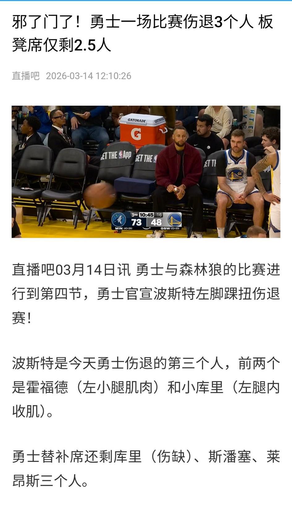 勇士输完爵士输公牛,偏偏能赢火箭。今天则完全被森林狼打服!爱德华兹在湖人快船那里受的气全撒在勇士身上。 勇士第三节一度追至97-107,但爱德华兹连续得分稳住优势。末节霍福德、赛斯·库里、波斯特接连伤退,替补席仅剩教练组,勇士彻底失去逆转可能。 最终森林狼127-117击败勇士,稳定了第六的位置。