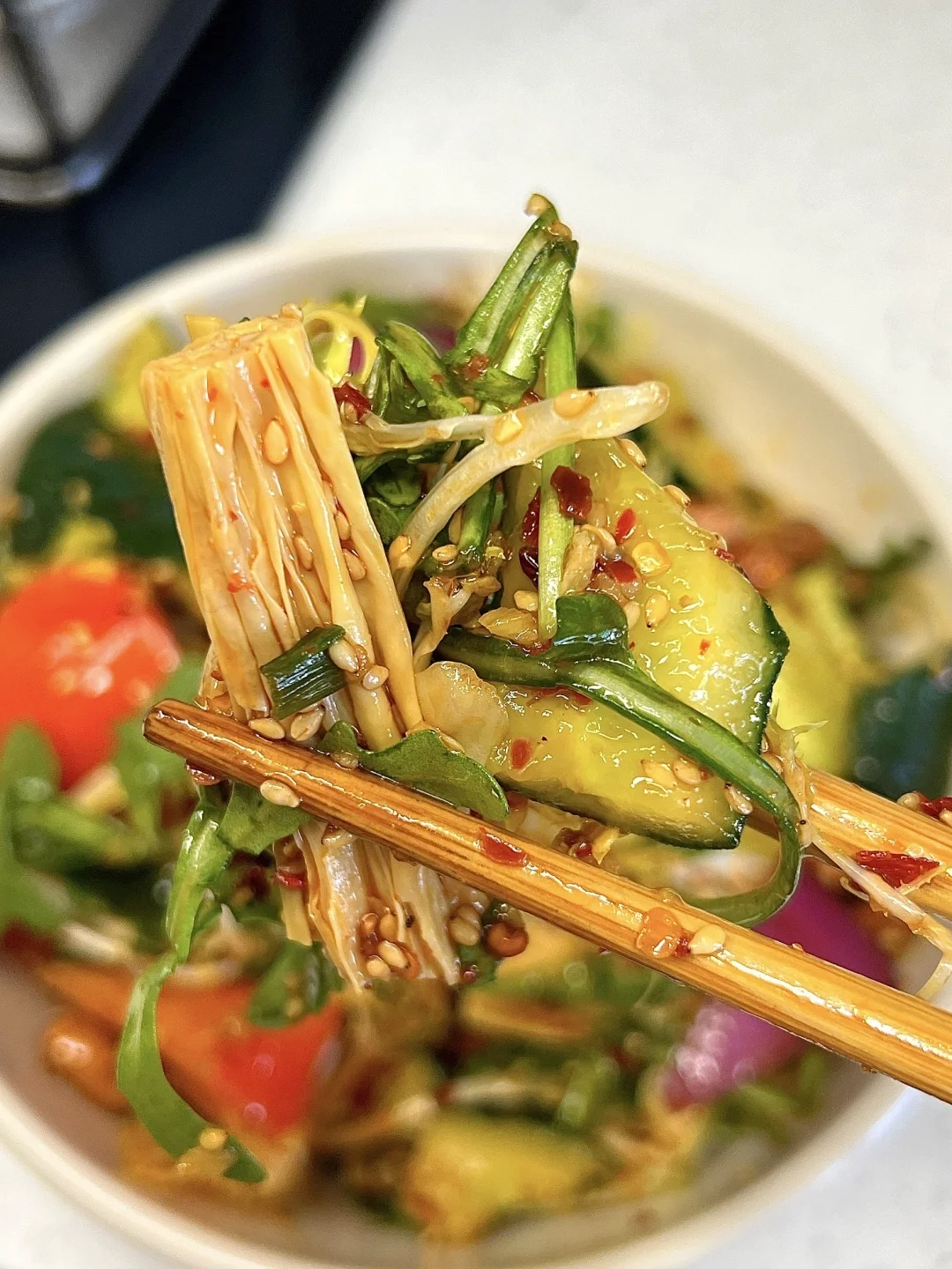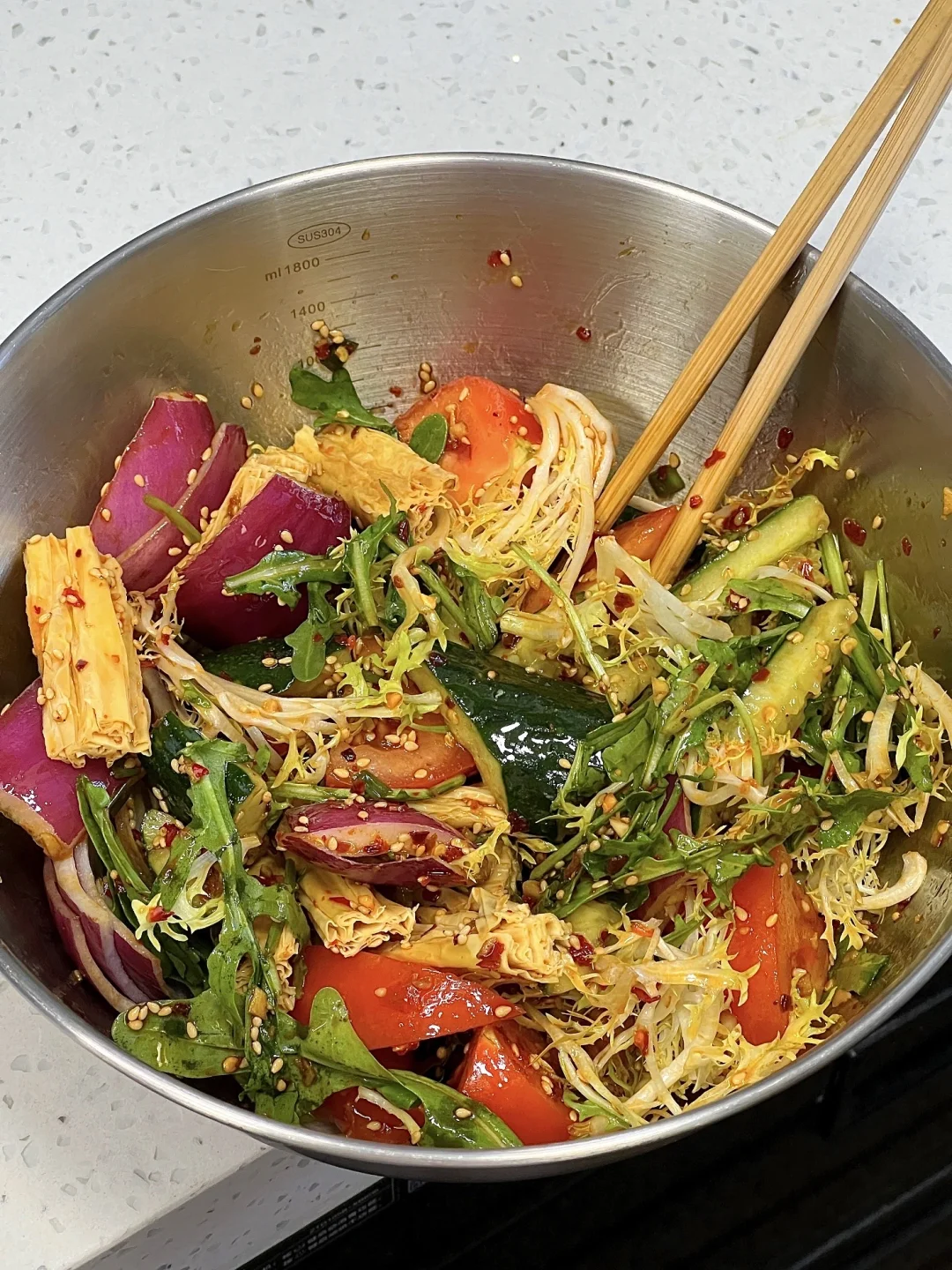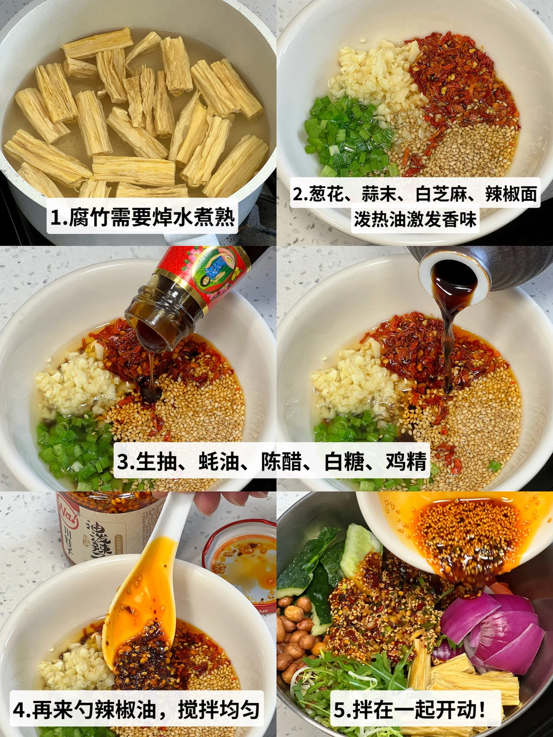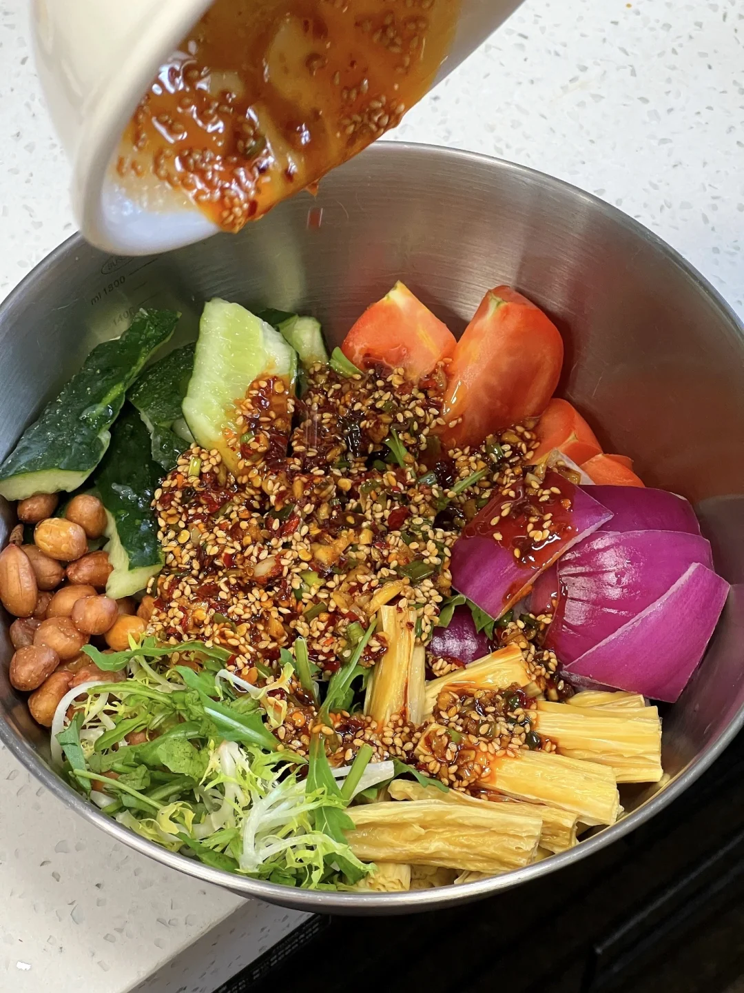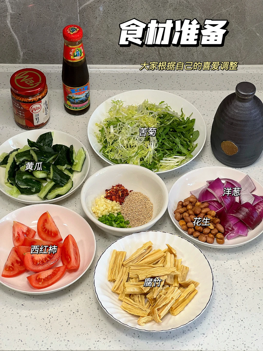 过年大鱼大肉吃的够够的 让男朋友跟网友们学做了手撕大拌菜,解腻低脂又爽口 📝食材准备: 苦菊、黄瓜、西红柿、腐竹、花生、洋葱 (大家可以根据自己的喜爱调整) 腐竹是之前在拼多多买的,还买了油泼辣子都很划算。男朋友跟网友学手艺,我跟拼多多囤食材,这波配合💯